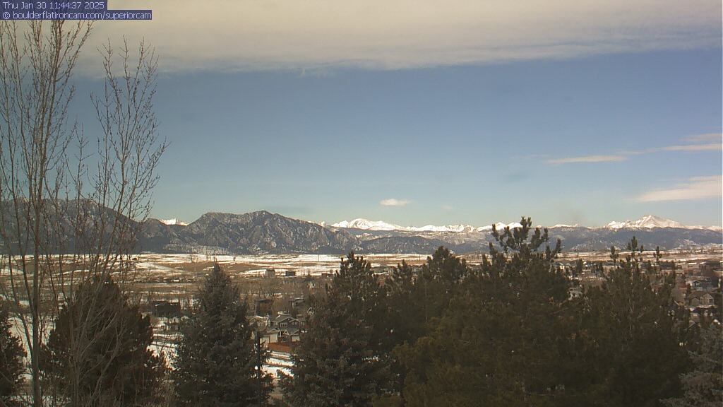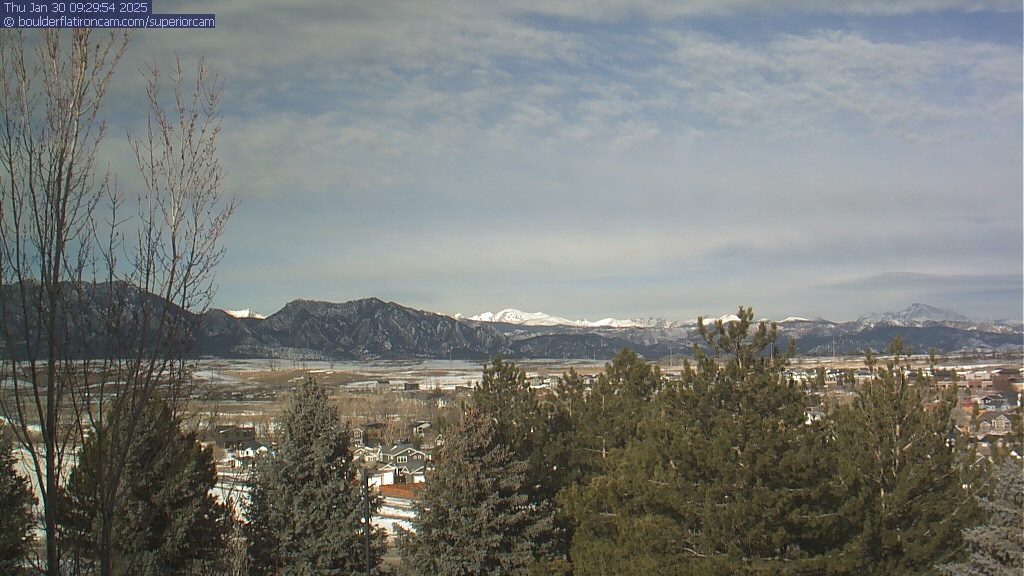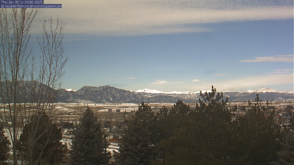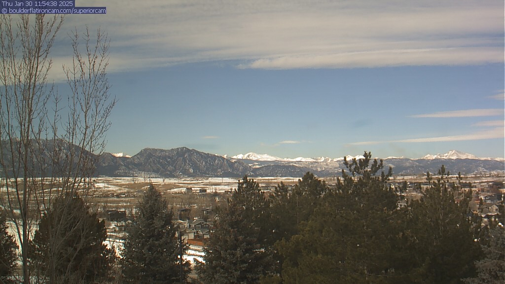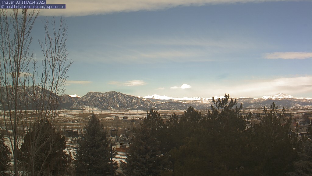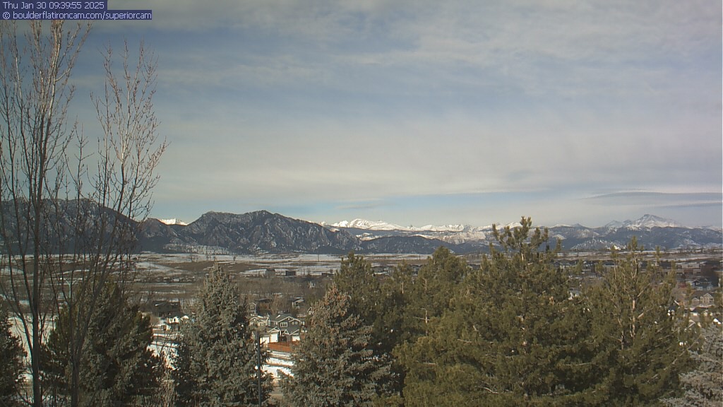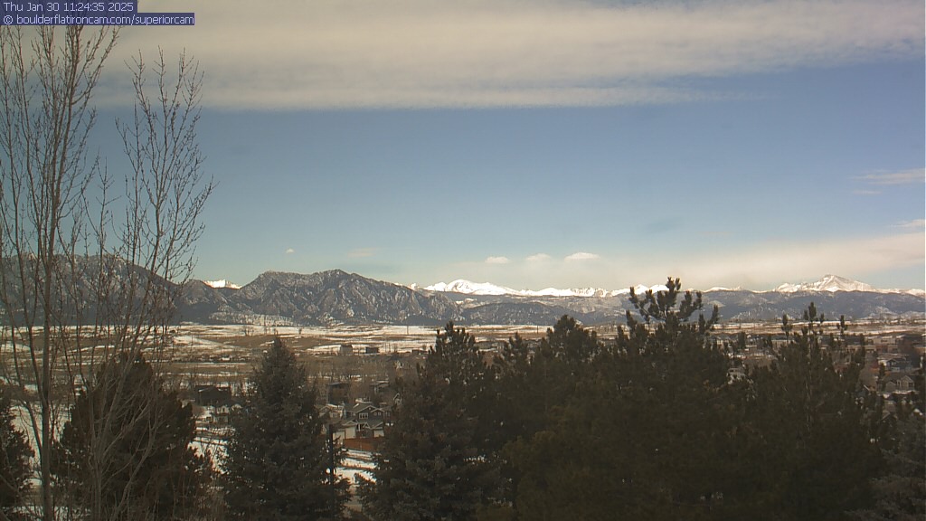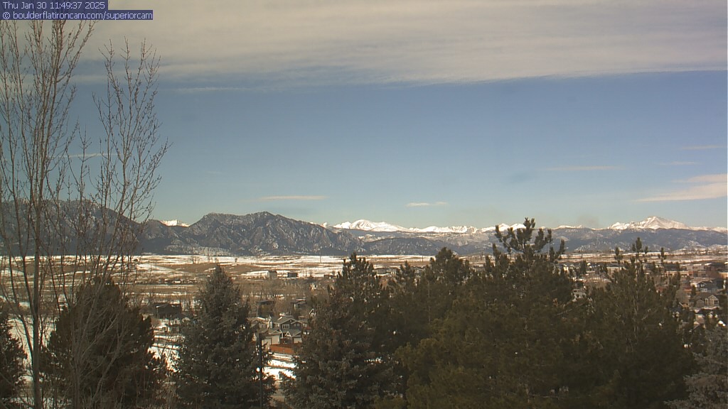 The Superior cam has a great view to the northwest over Boulder, the Flatirons, Indian Peaks and Long’s Peak.   The Coal Creek trail is visible in the foreground with old town Superior.  Thanks to Aweida Venture Partners management for the great view.