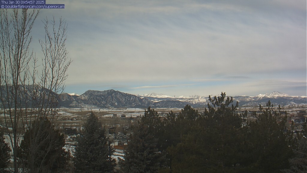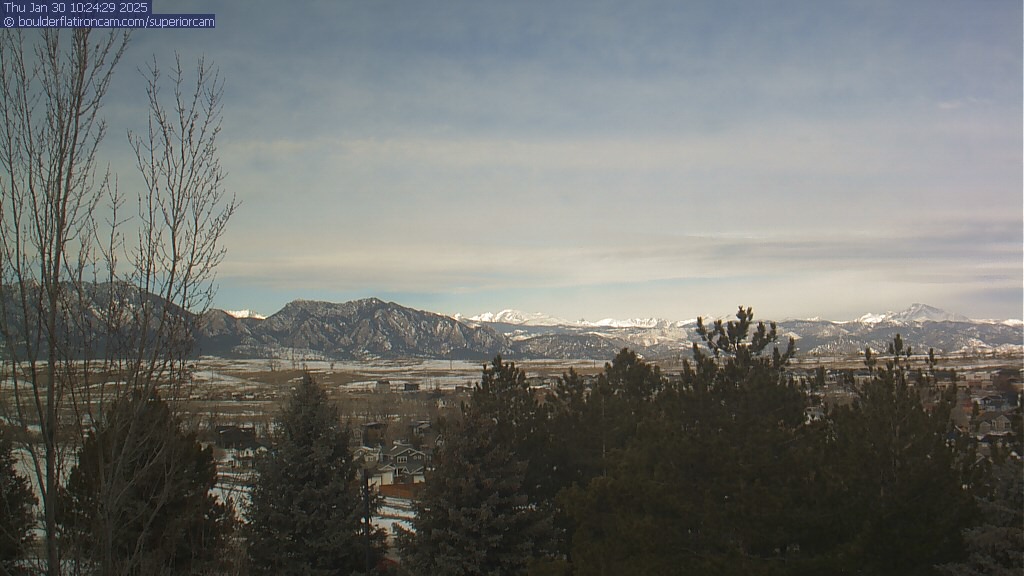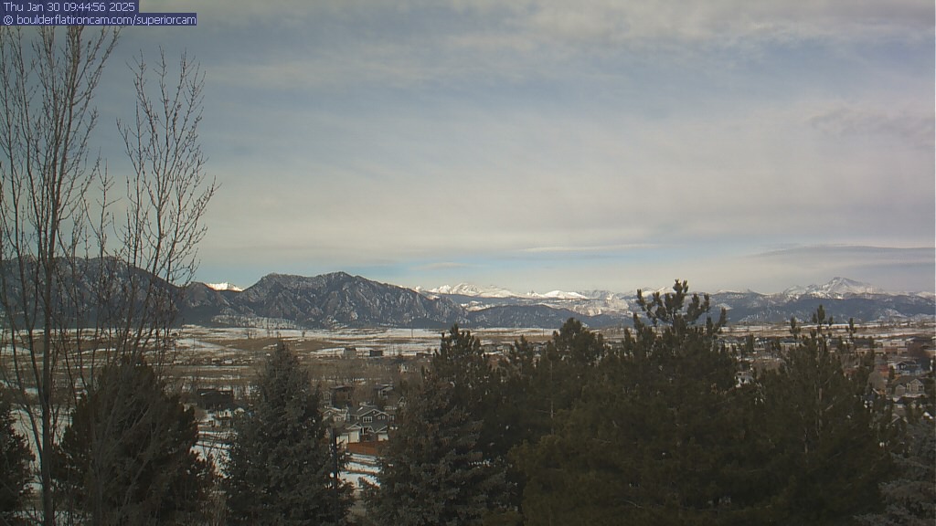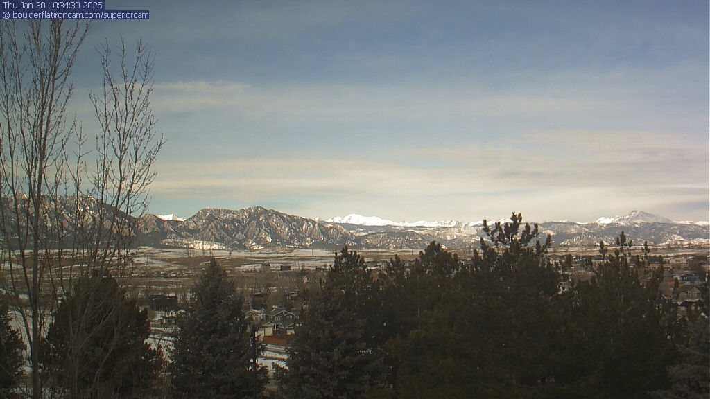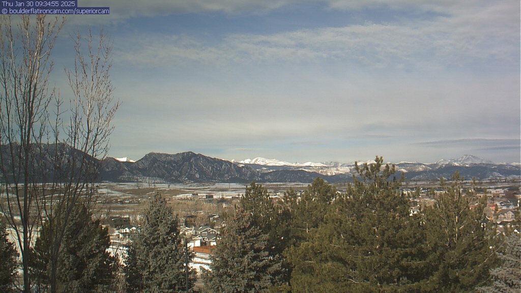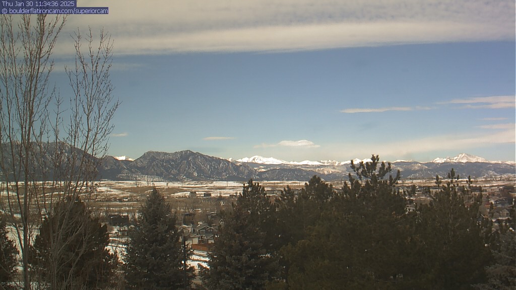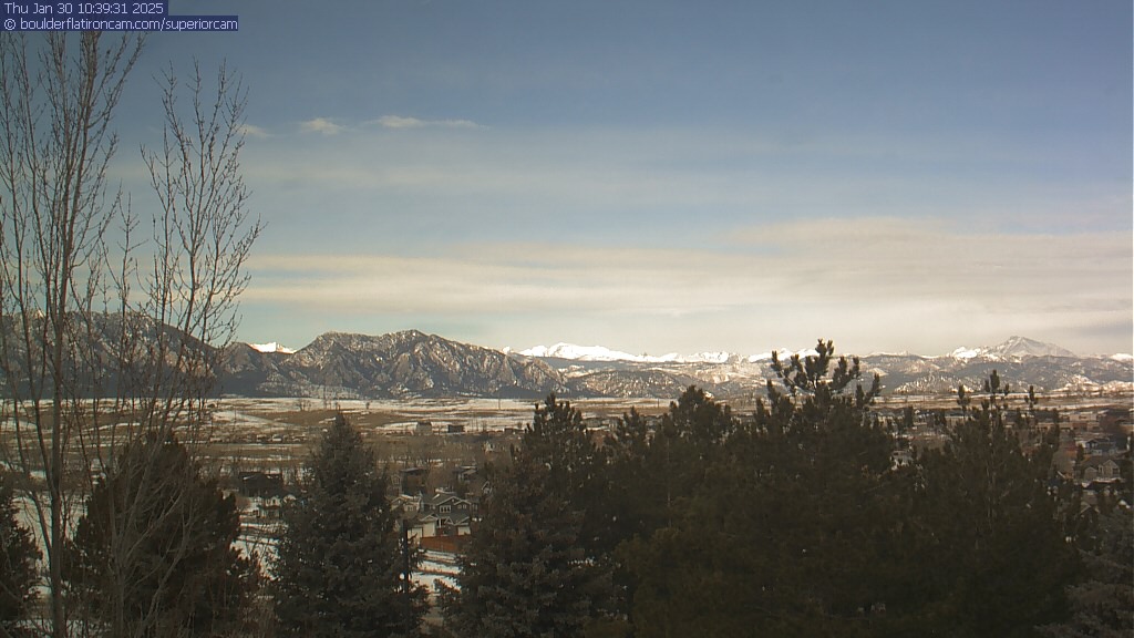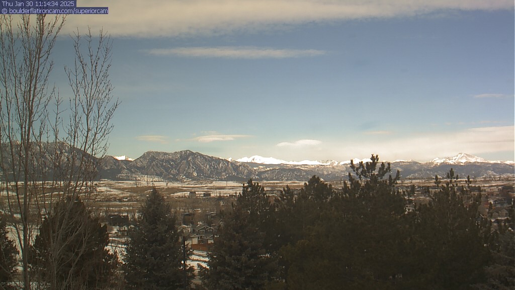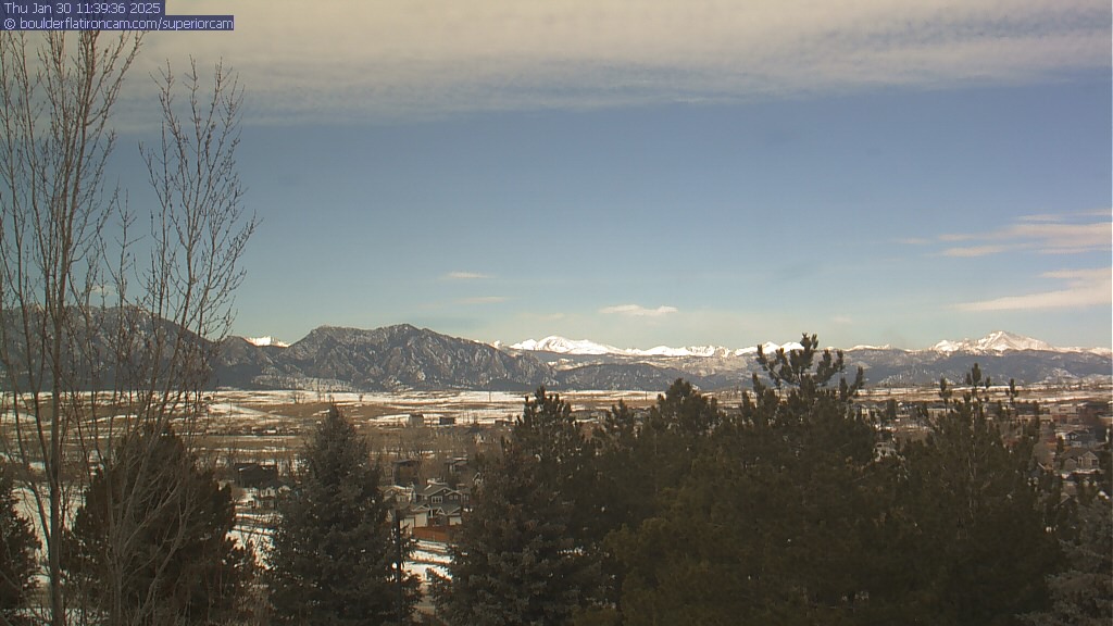 The Superior cam has a great view to the northwest over Boulder, the Flatirons, Indian Peaks and Long’s Peak.   The Coal Creek trail is visible in the foreground with old town Superior.  Thanks to Aweida Venture Partners management for the great view.