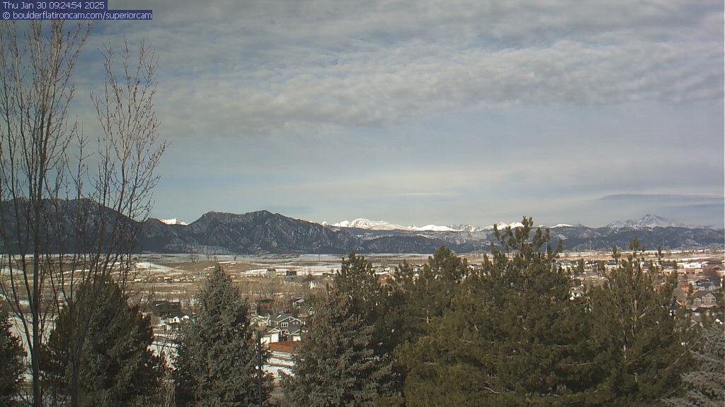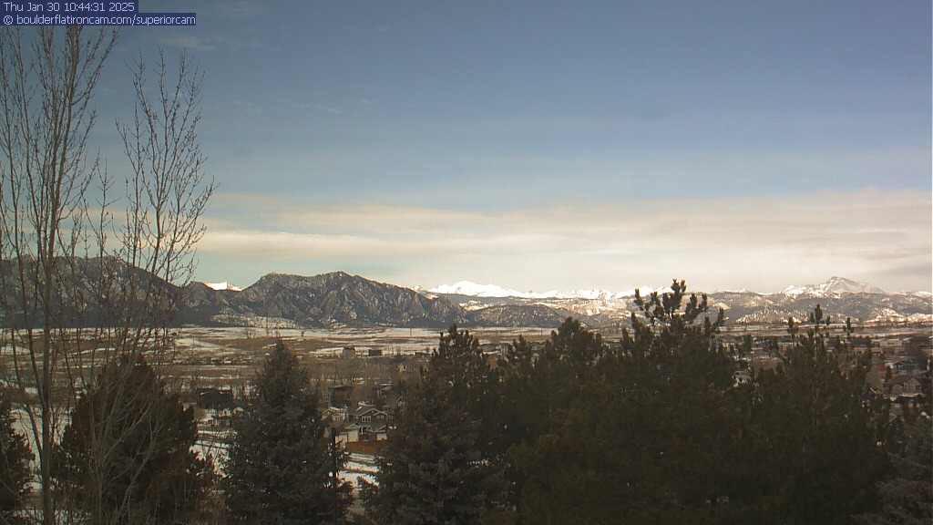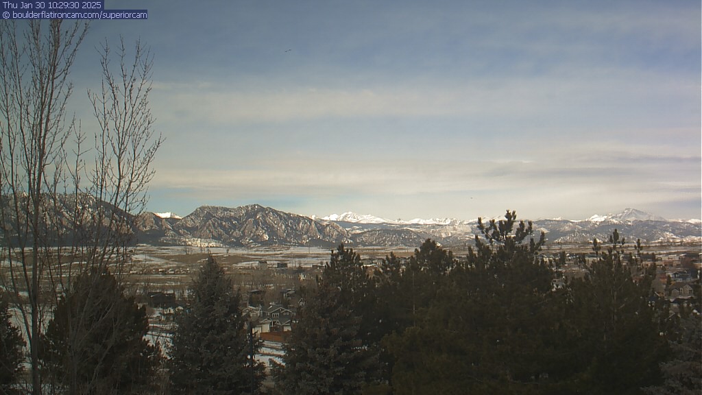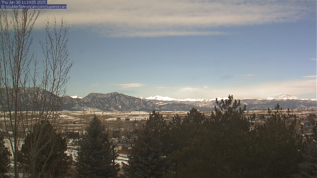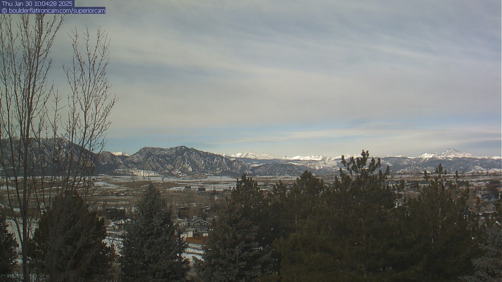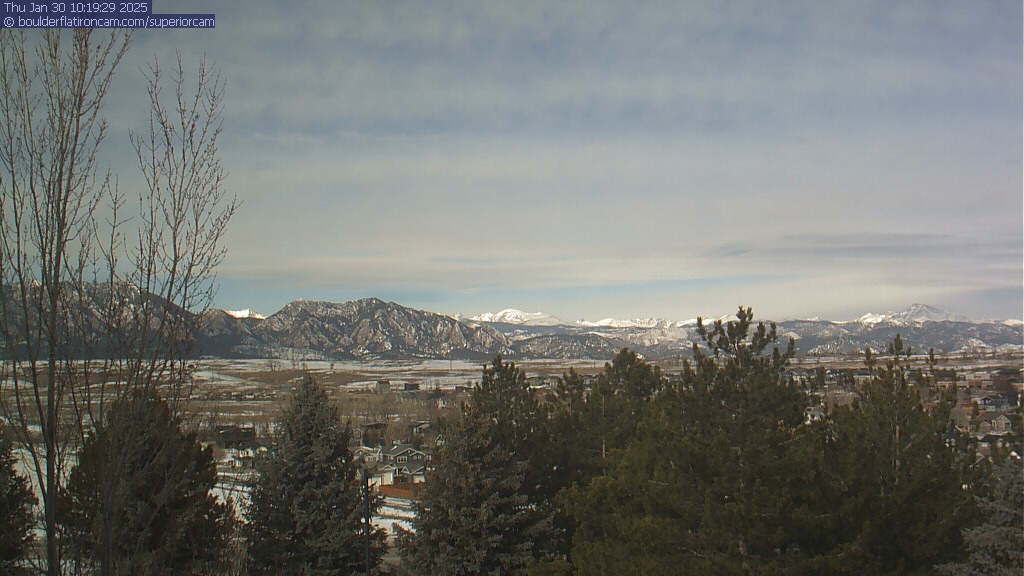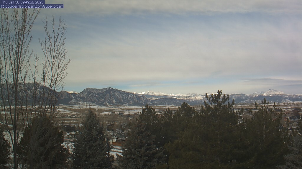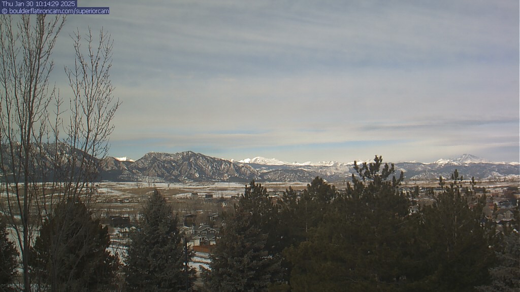 The Superior cam has a great view to the northwest over Boulder, the Flatirons, Indian Peaks and Long’s Peak.   The Coal Creek trail is visible in the foreground with old town Superior.  Thanks to Aweida Venture Partners management for the great view.