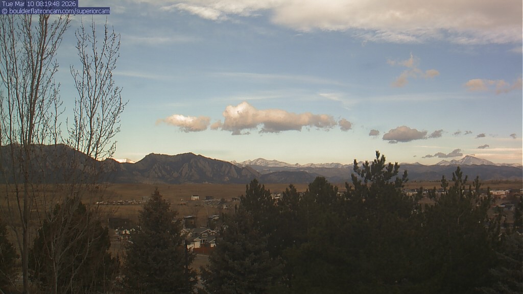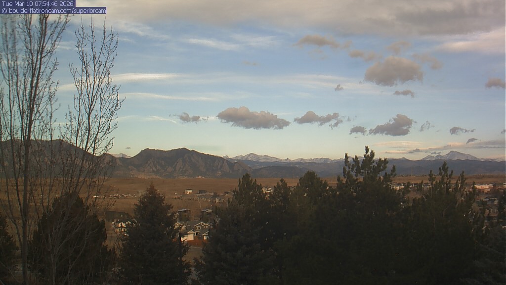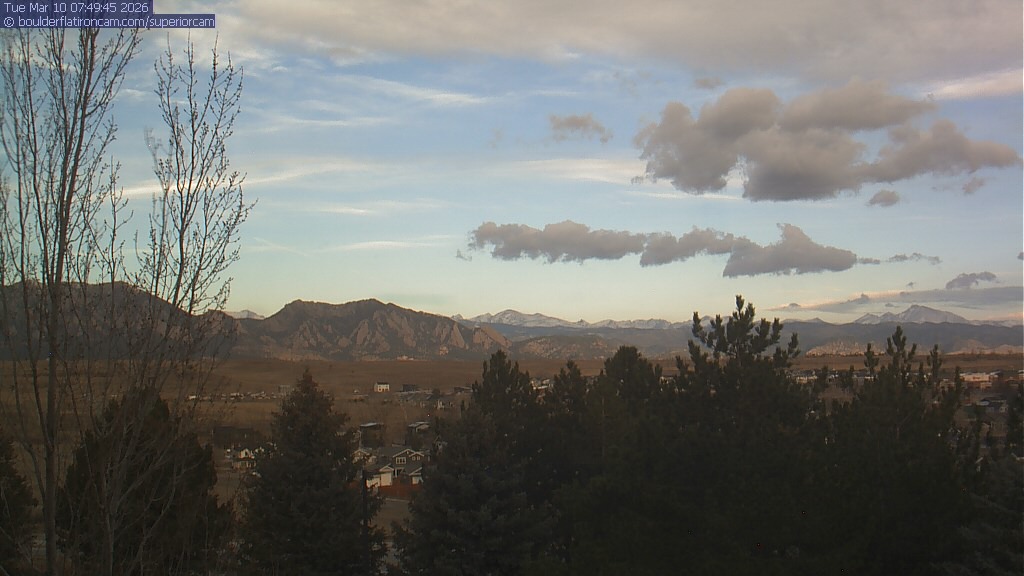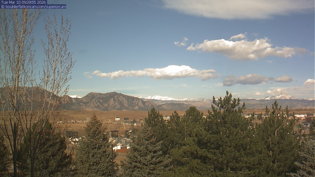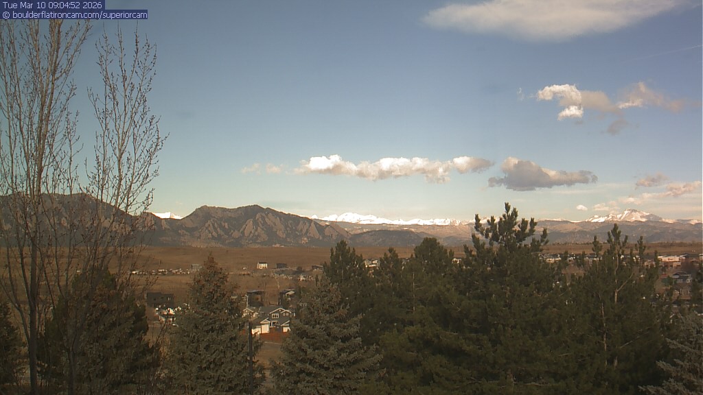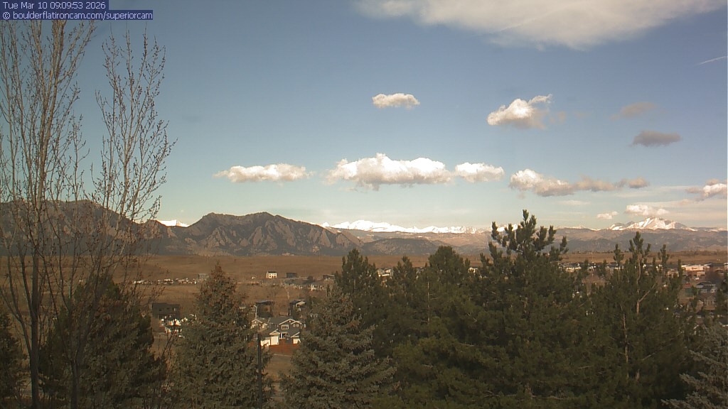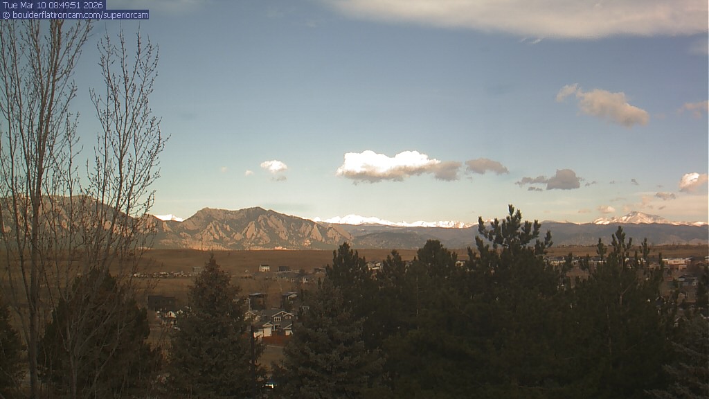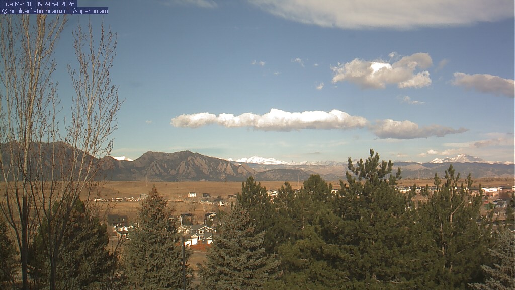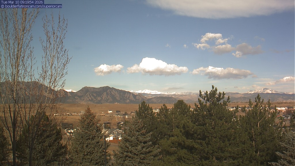 The Superior cam has a view to the northwest over Boulder, the Flatirons, Indian Peaks and Long’s Peak.   The Coal Creek trail is visible in the foreground with old town Superior.