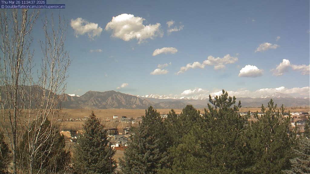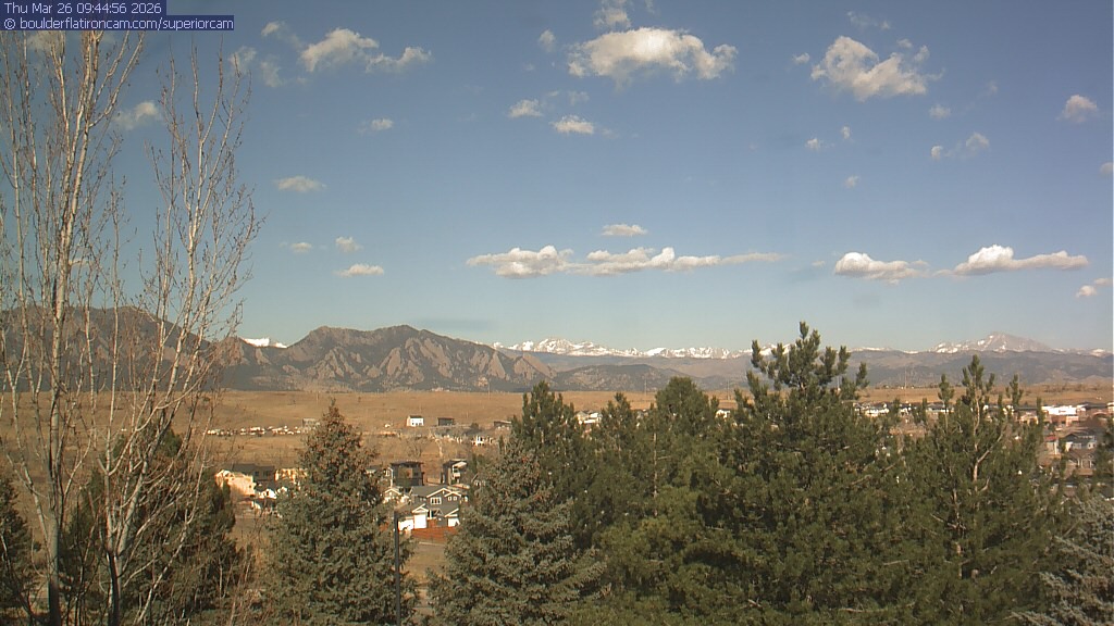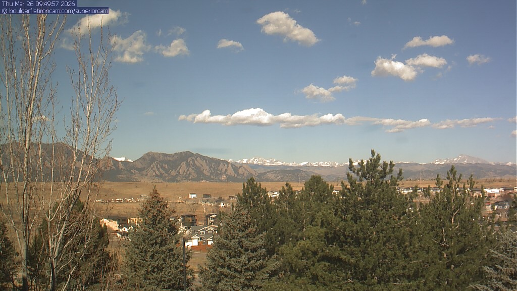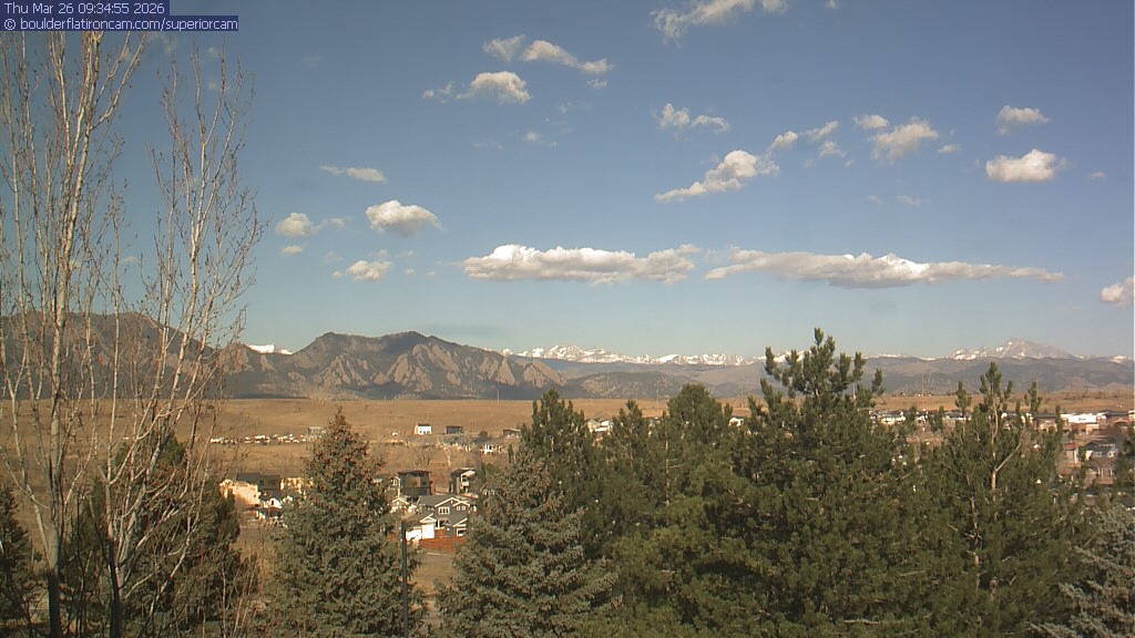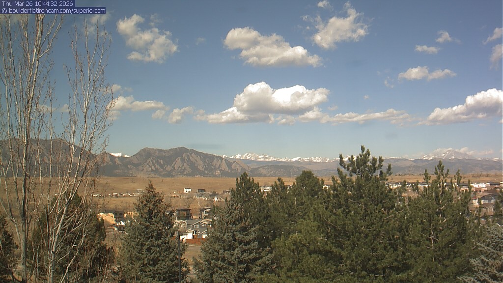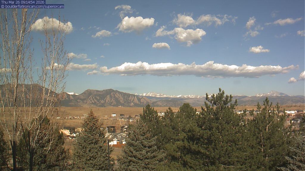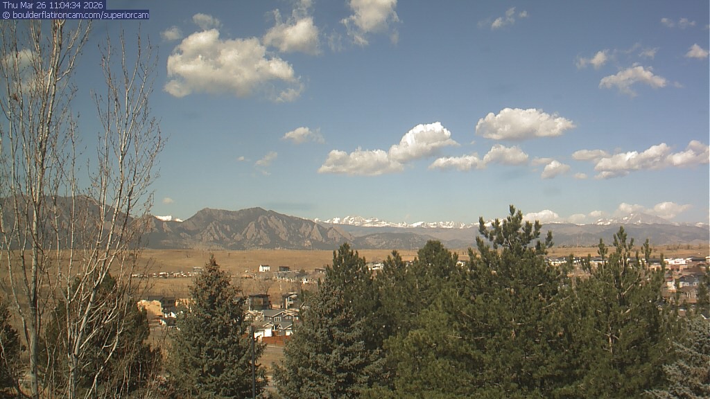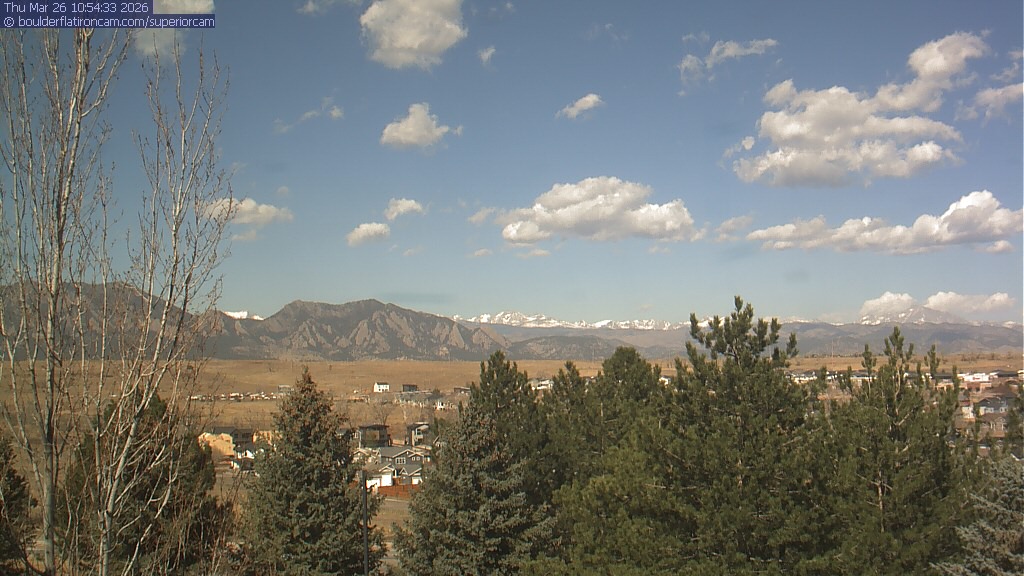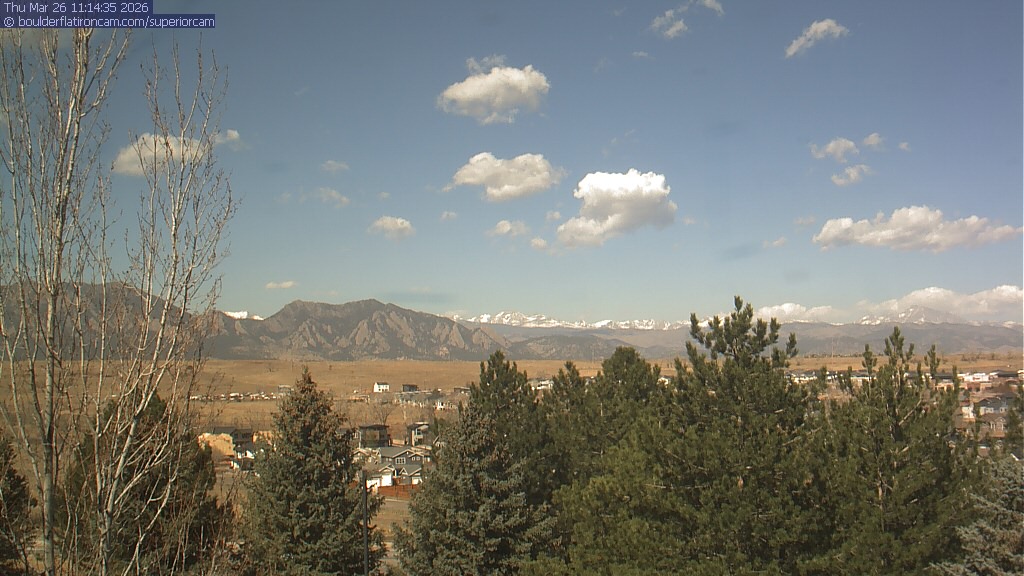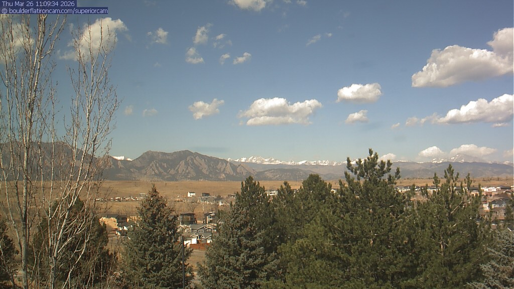 The Superior cam has a view to the northwest over Boulder, the Flatirons, Indian Peaks and Long’s Peak.   The Coal Creek trail is visible in the foreground with old town Superior.