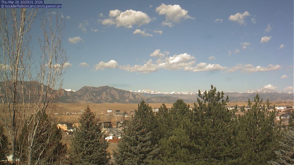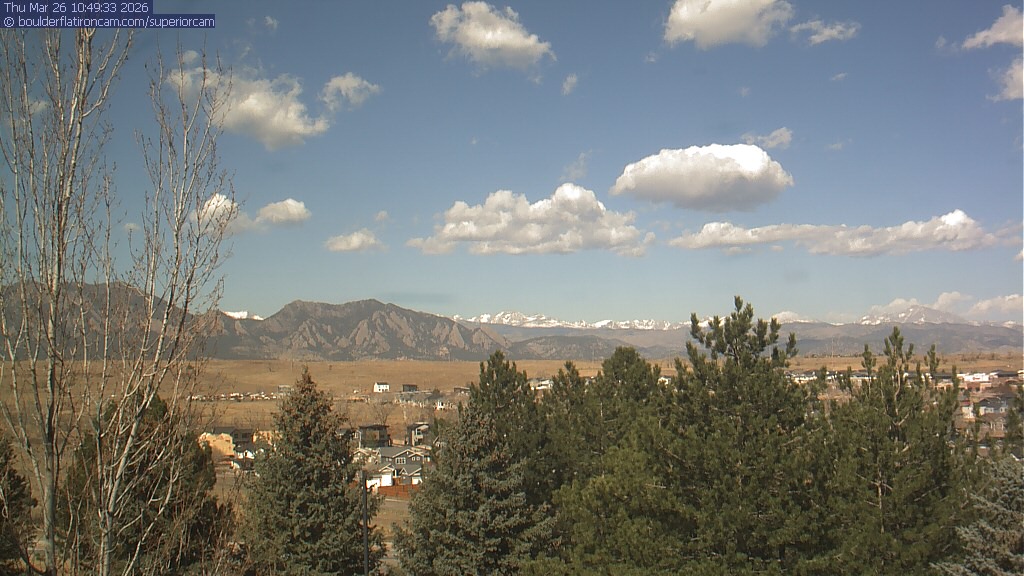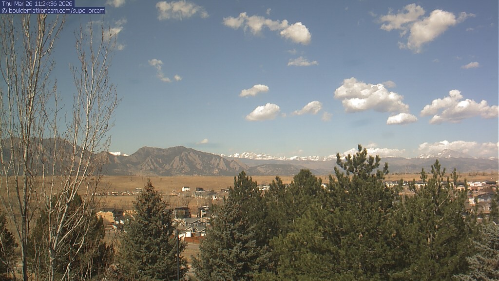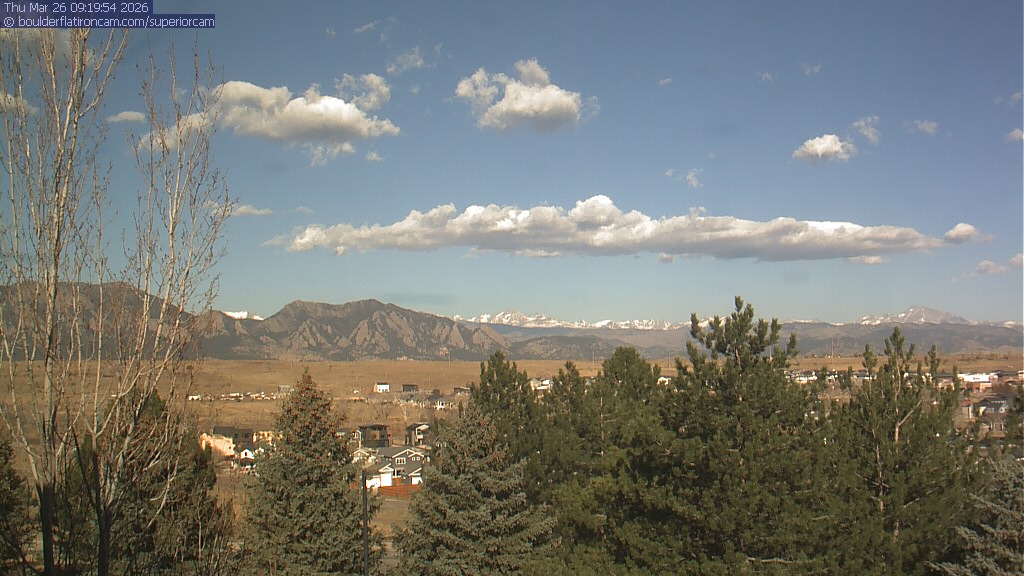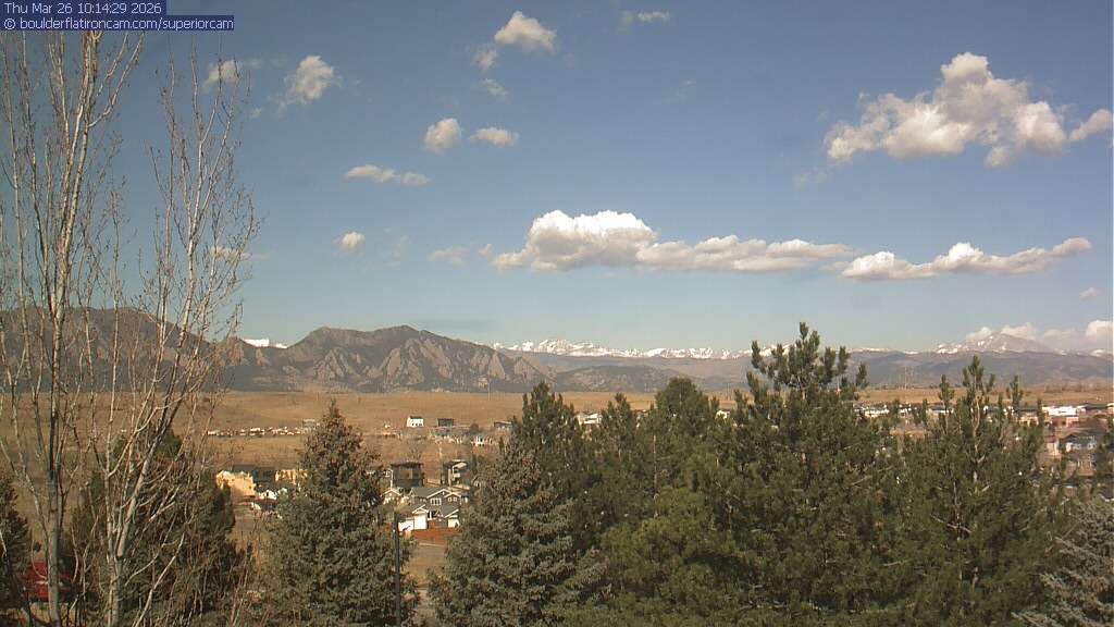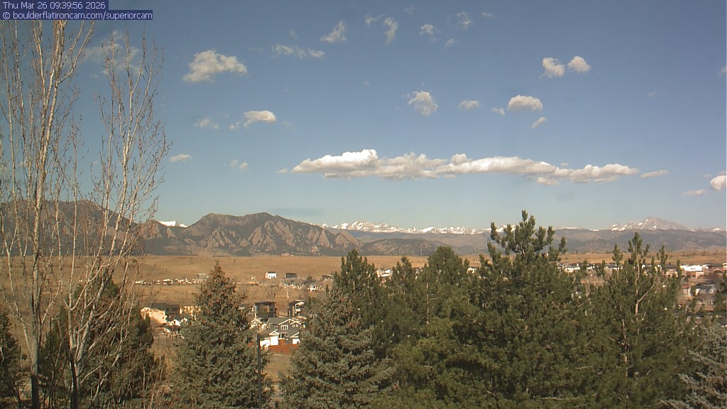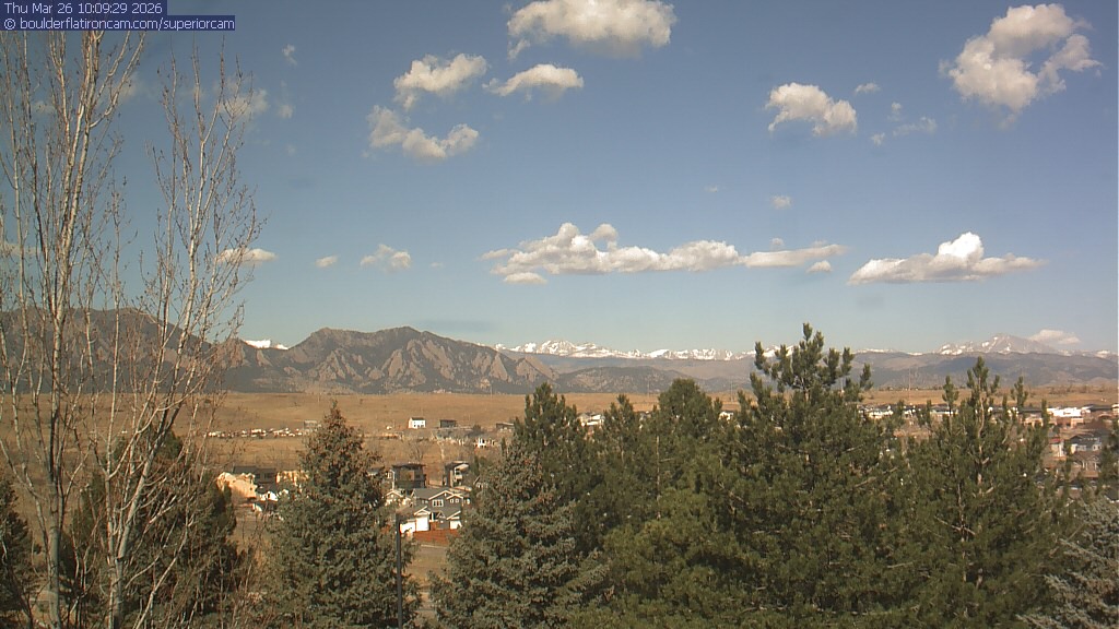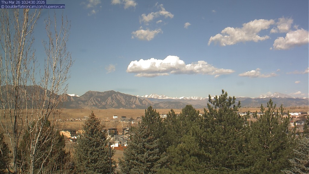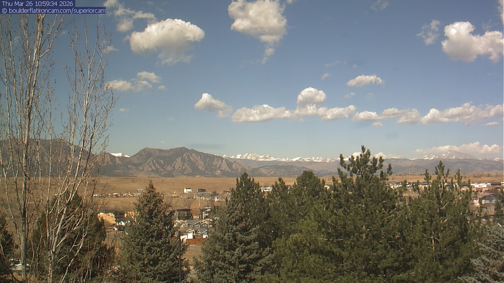 The Superior cam has a view to the northwest over Boulder, the Flatirons, Indian Peaks and Long’s Peak.   The Coal Creek trail is visible in the foreground with old town Superior.