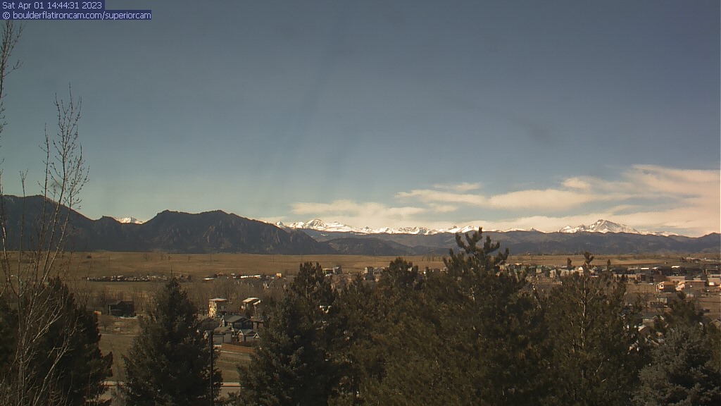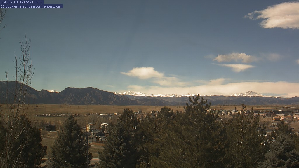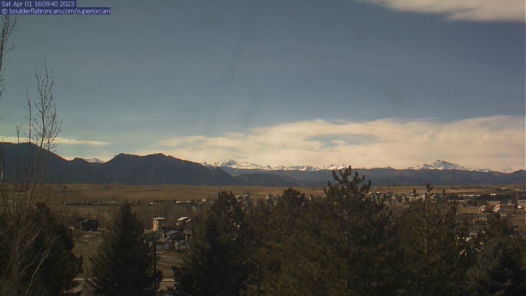 The Superior cam has a great view to the northwest over Boulder, the Flatirons, Indian Peaks and Long’s Peak.   The Coal Creek trail is visible in the foreground with old town Superior.  Thanks to Aweida Venture Partners management for the great view.