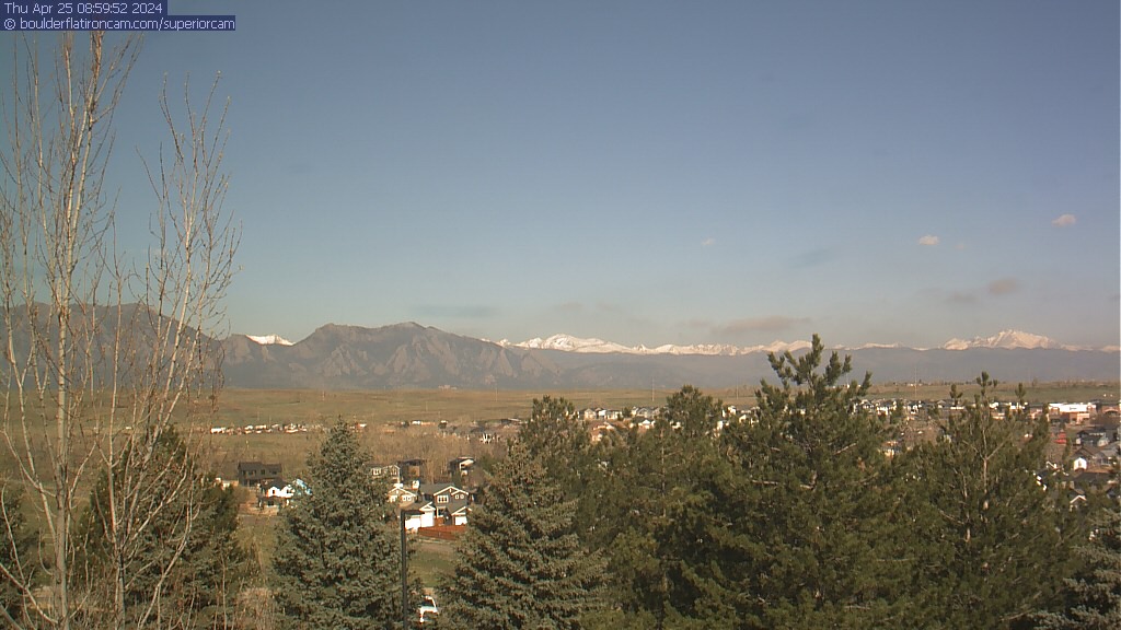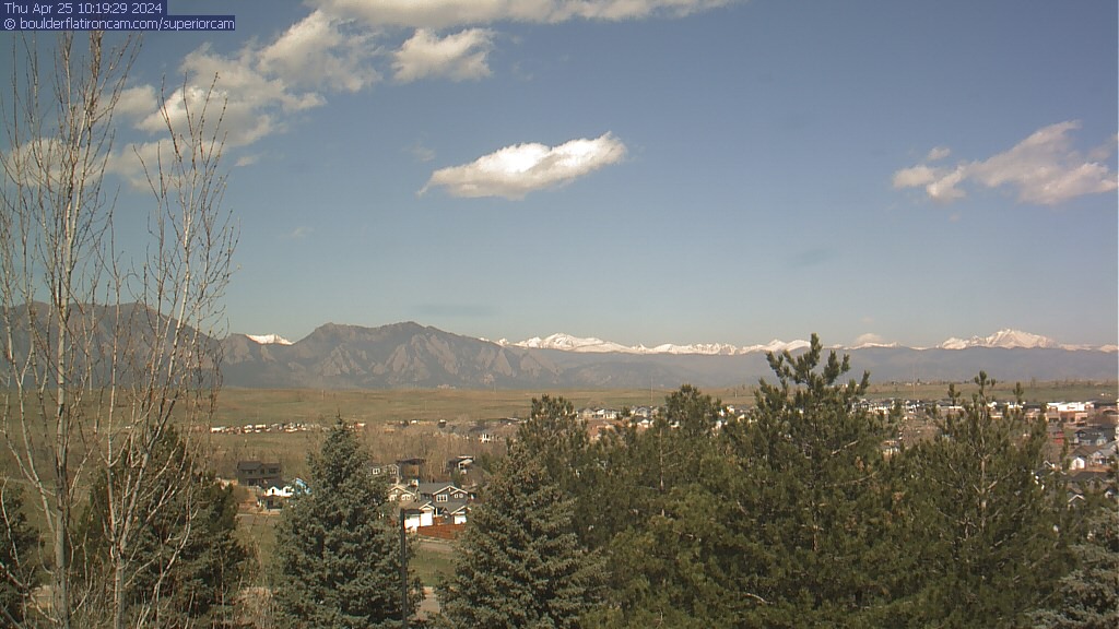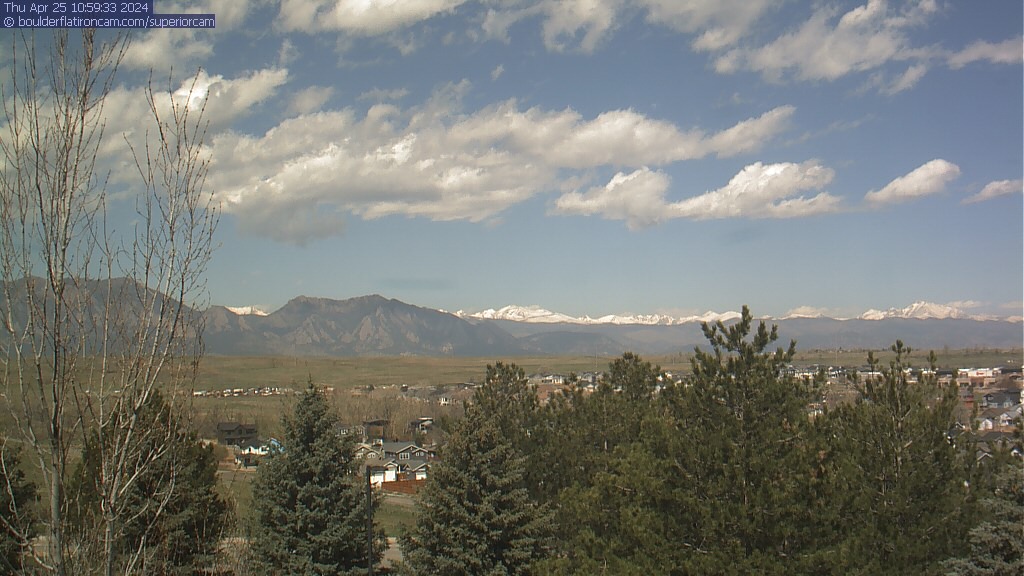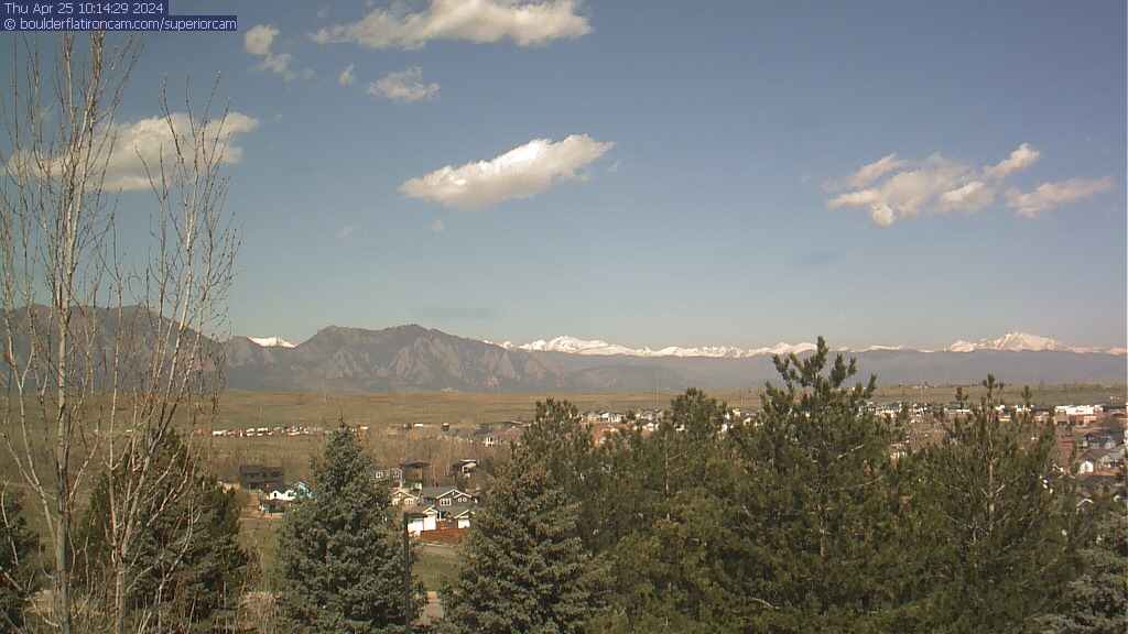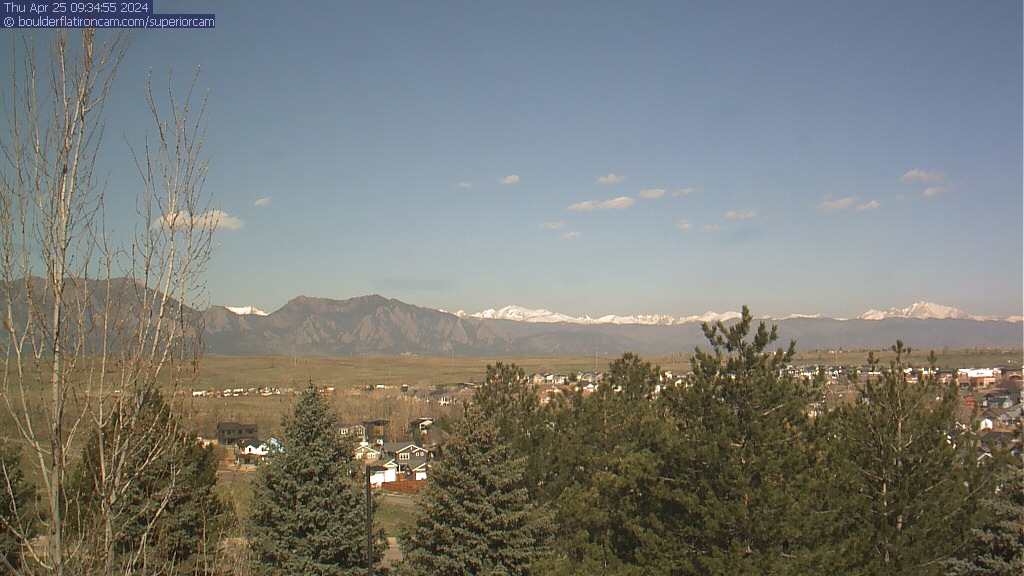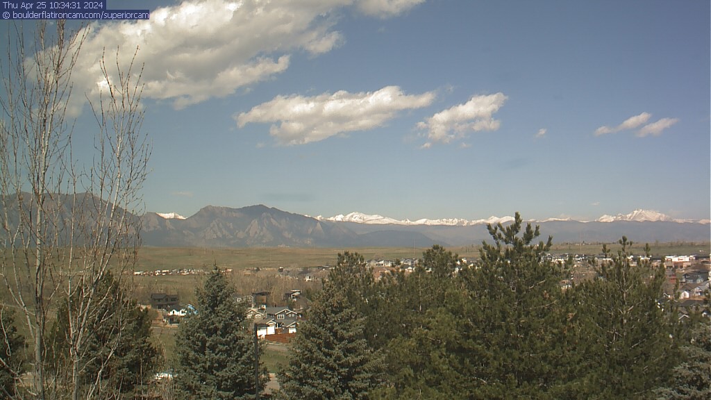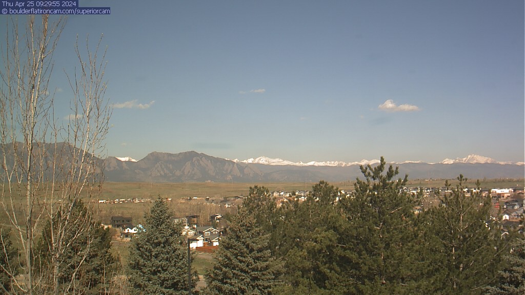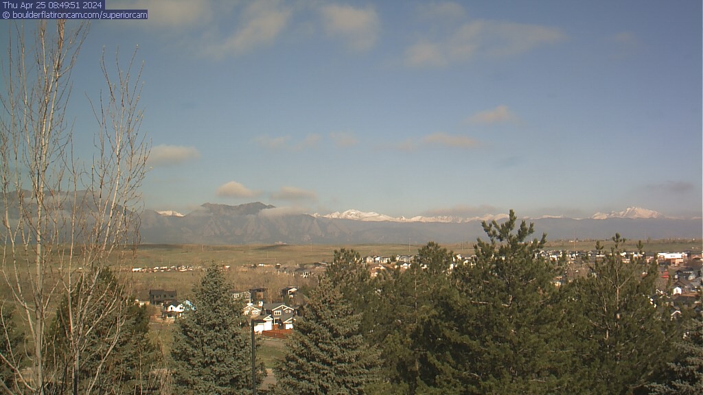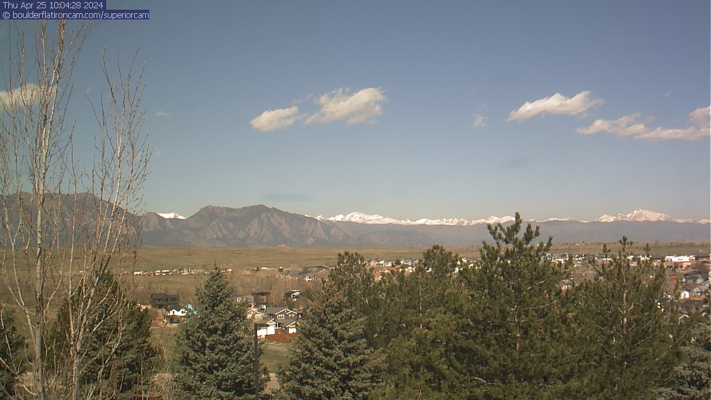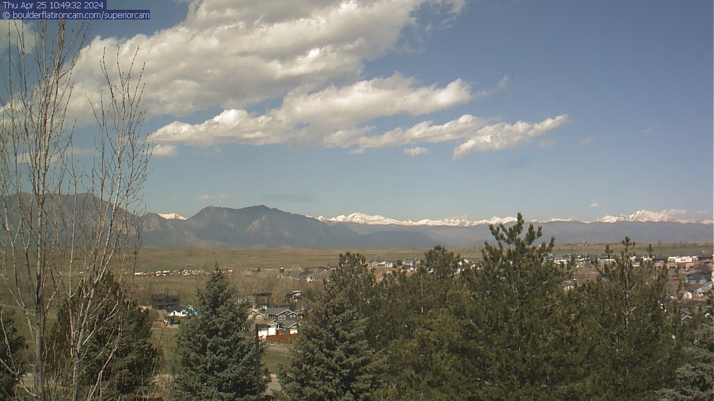The Superior cam has a great view to the northwest over Boulder, the Flatirons, Indian Peaks and Long’s Peak.   The Coal Creek trail is visible in the foreground with old town Superior.  Thanks to Aweida Venture Partners management for the great view.