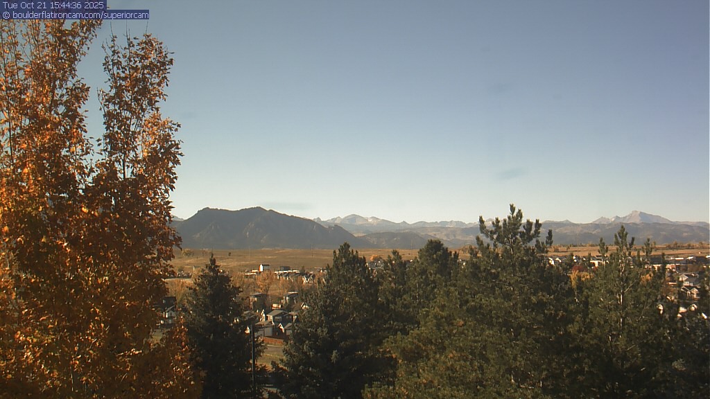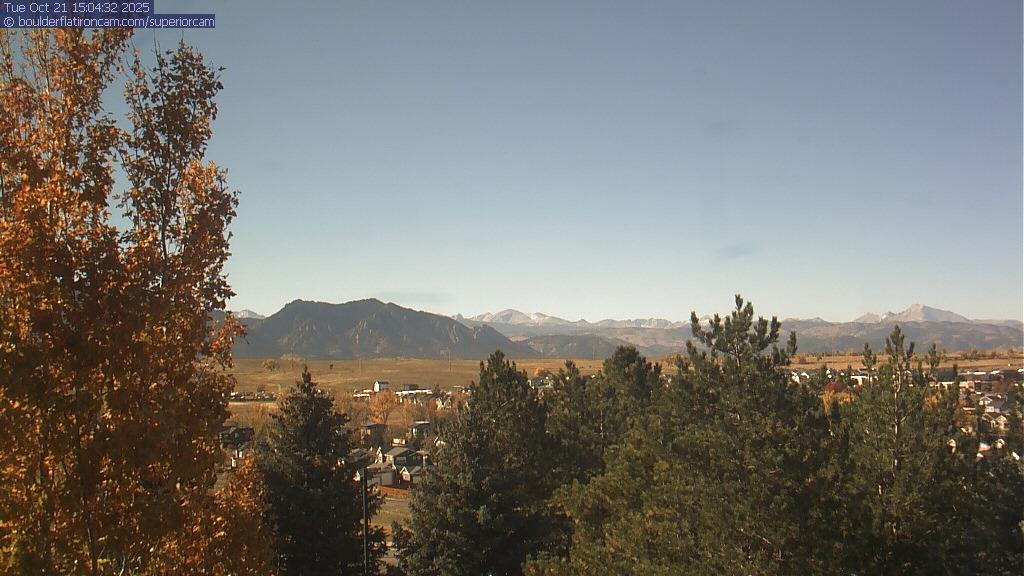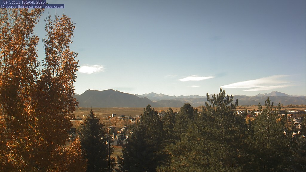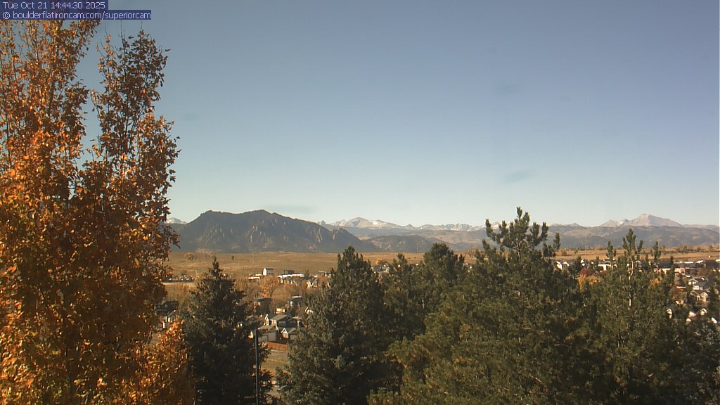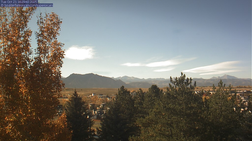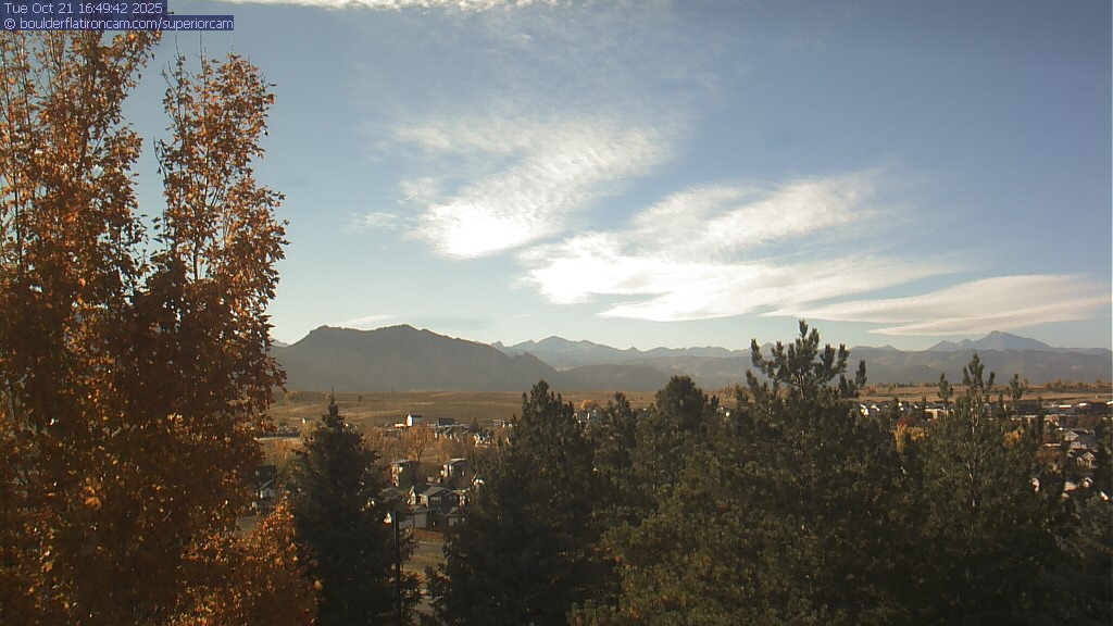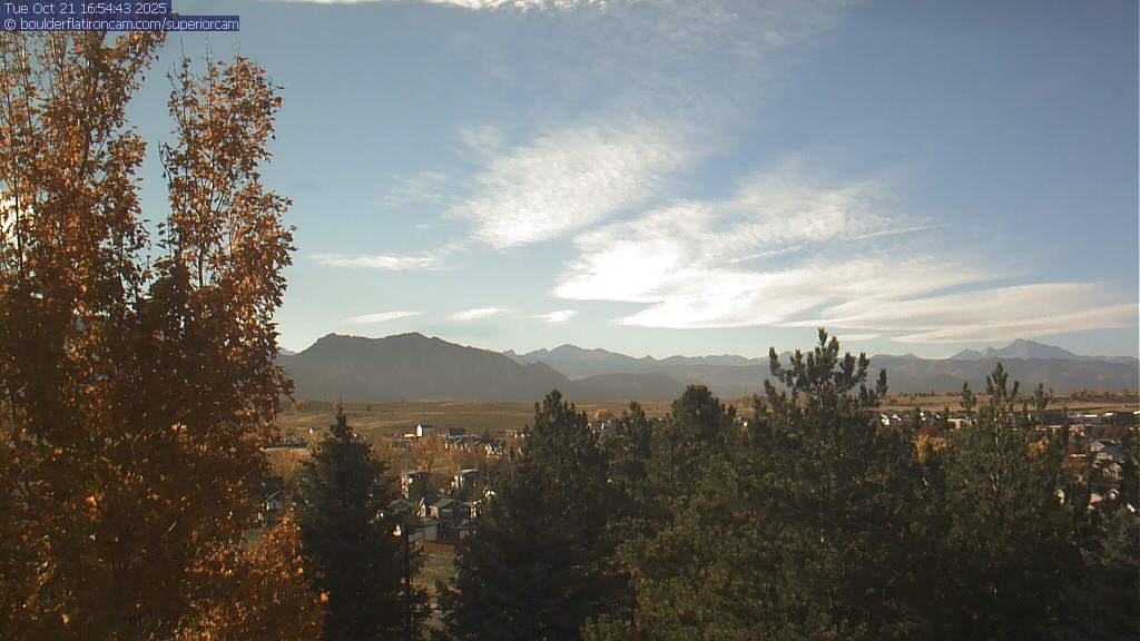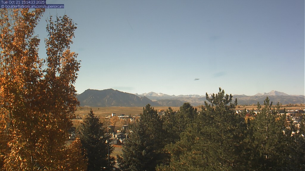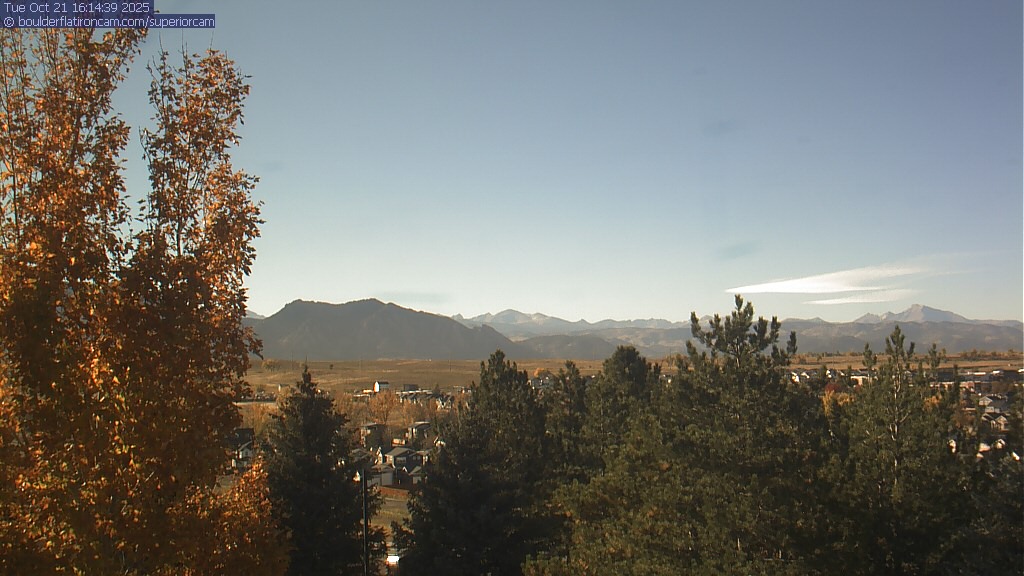 The Superior cam has a great view to the northwest over Boulder, the Flatirons, Indian Peaks and Long’s Peak.   The Coal Creek trail is visible in the foreground with old town Superior.  Thanks to Aweida Venture Partners management for the great view.
