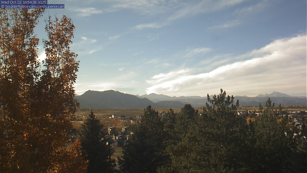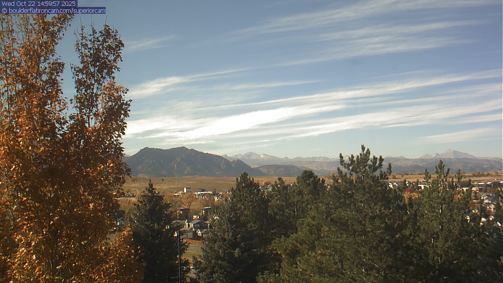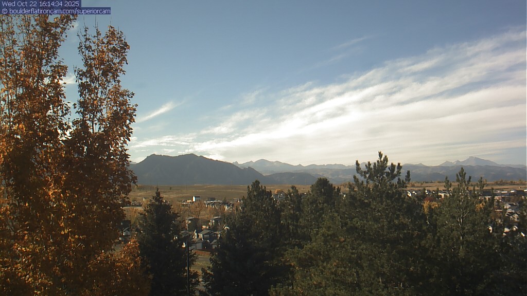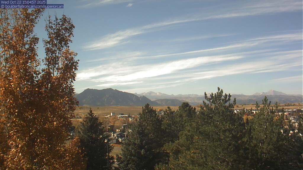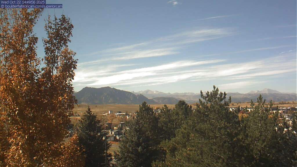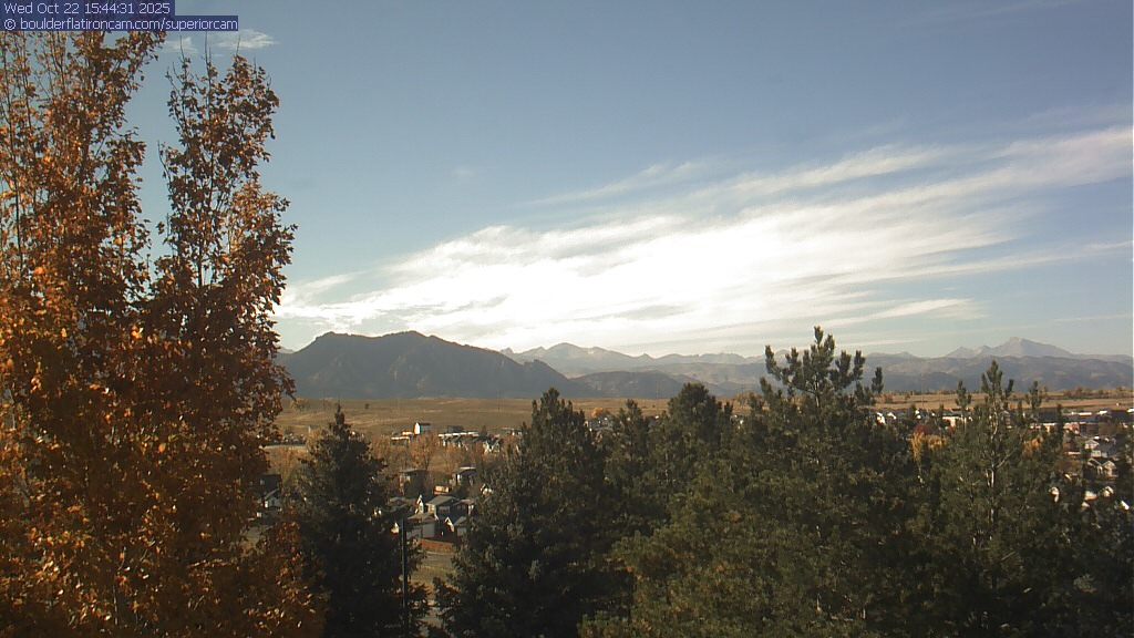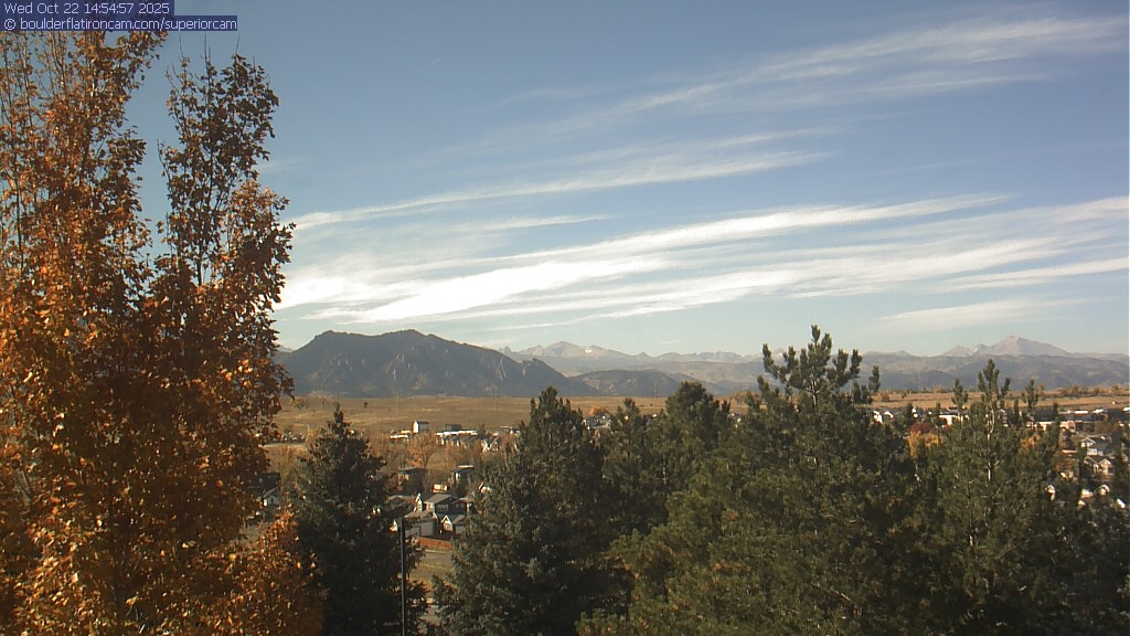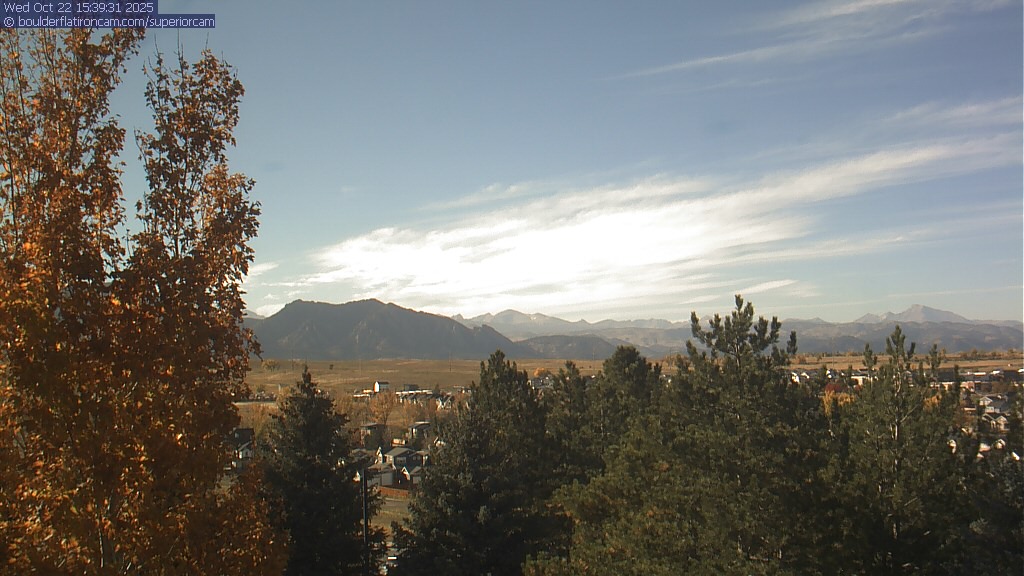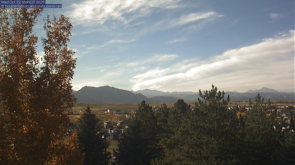 The Superior cam has a great view to the northwest over Boulder, the Flatirons, Indian Peaks and Long’s Peak.   The Coal Creek trail is visible in the foreground with old town Superior.  Thanks to Aweida Venture Partners management for the great view.