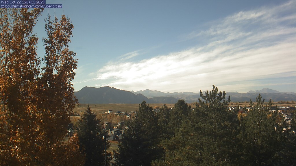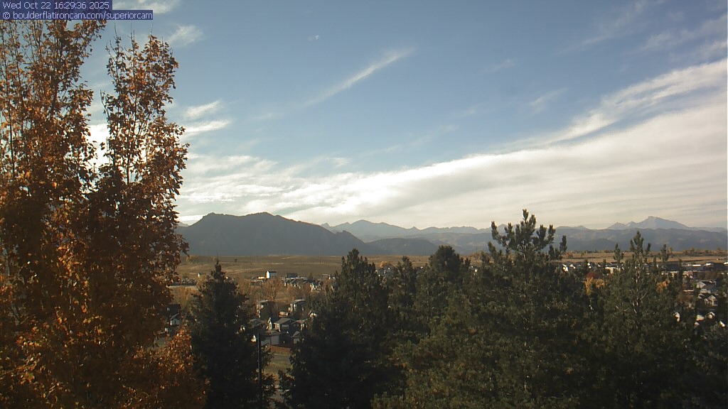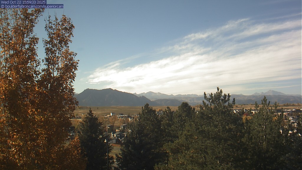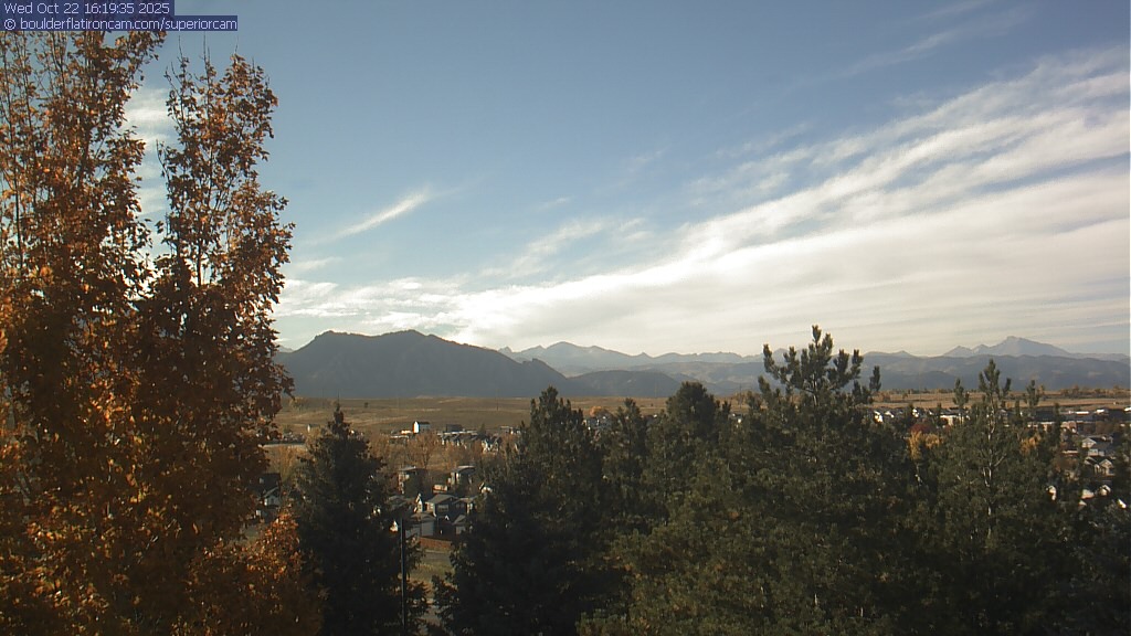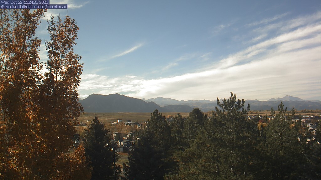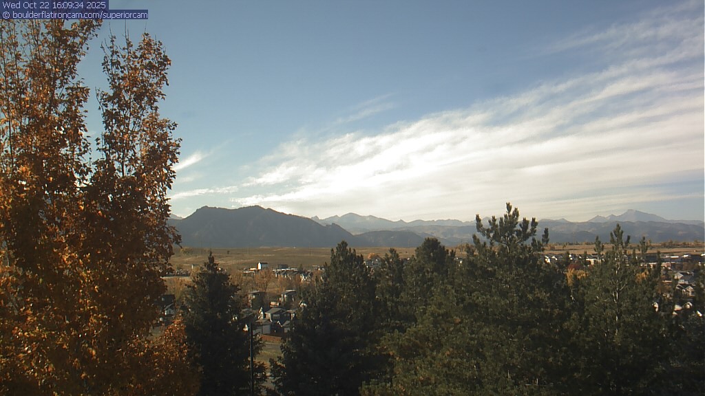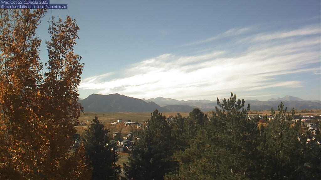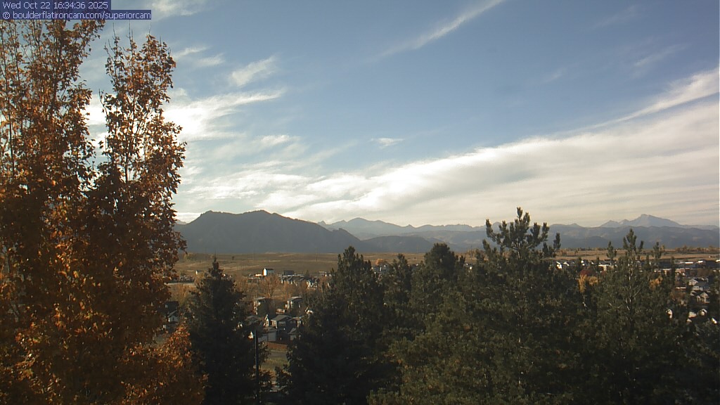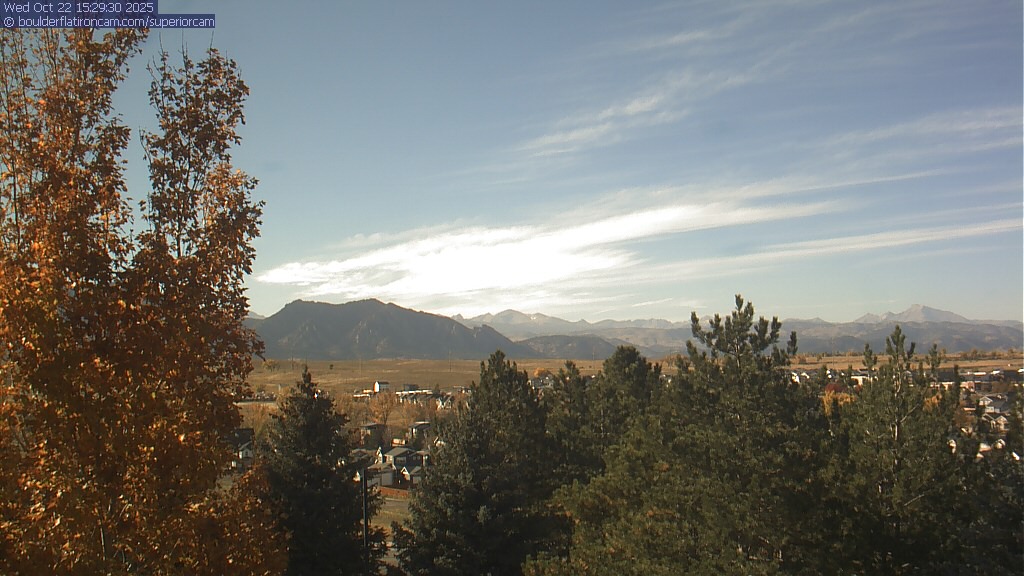 The Superior cam has a great view to the northwest over Boulder, the Flatirons, Indian Peaks and Long’s Peak.   The Coal Creek trail is visible in the foreground with old town Superior.  Thanks to Aweida Venture Partners management for the great view.