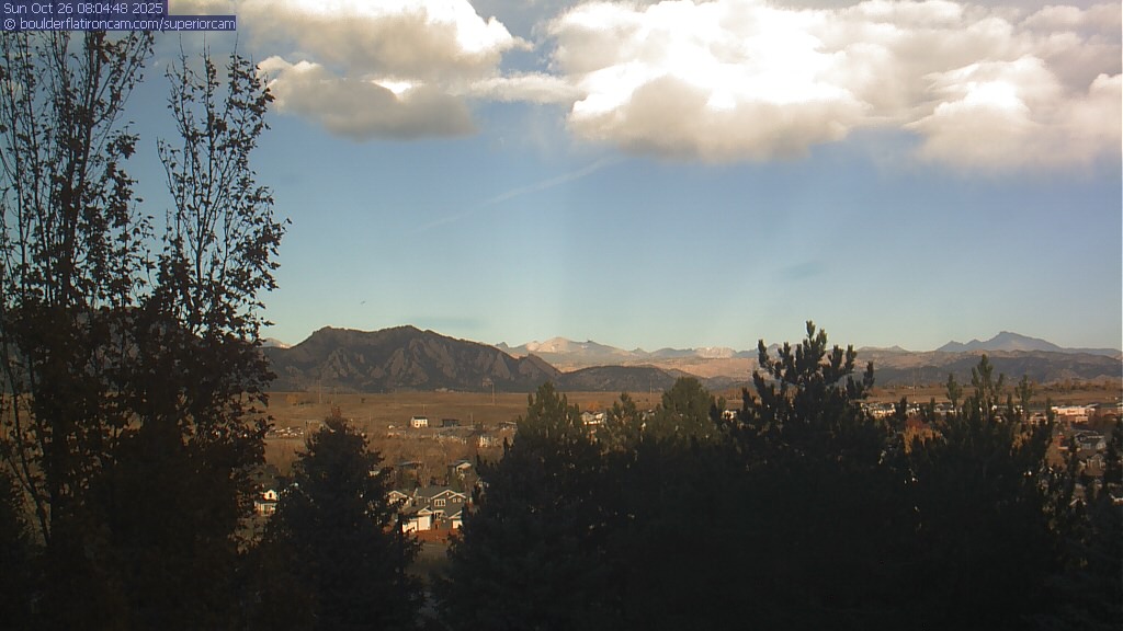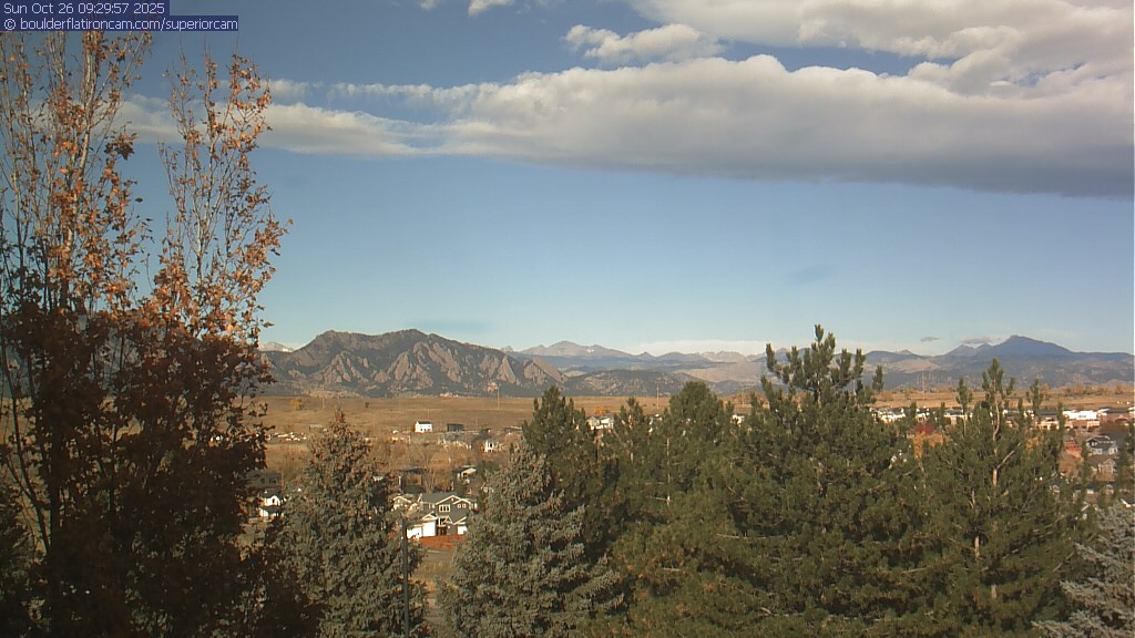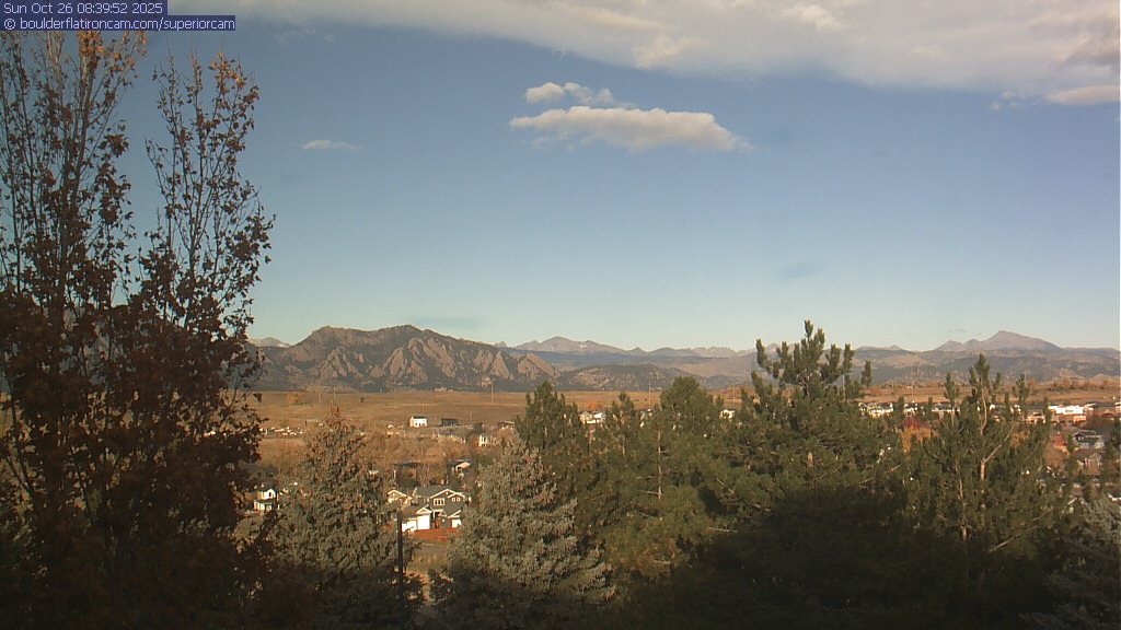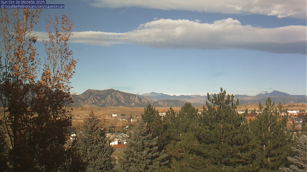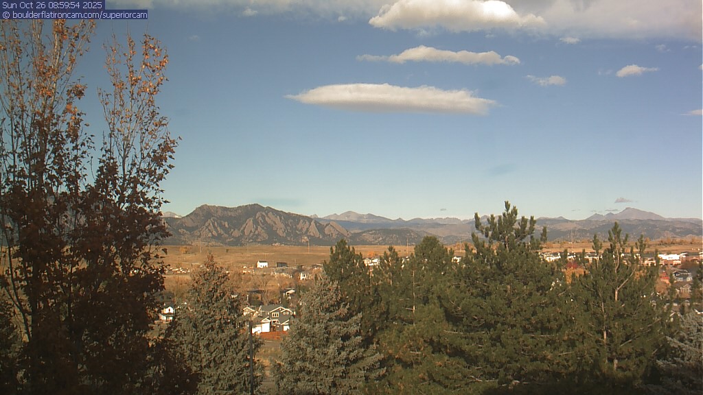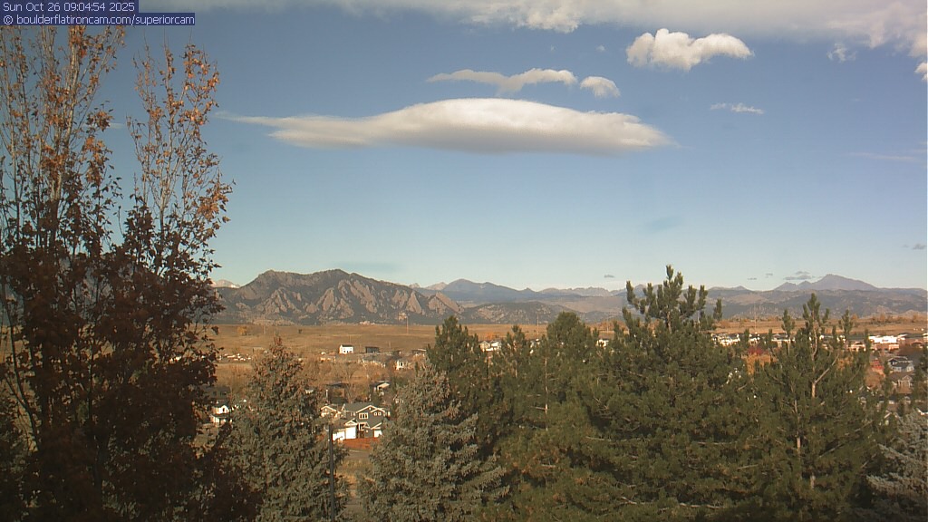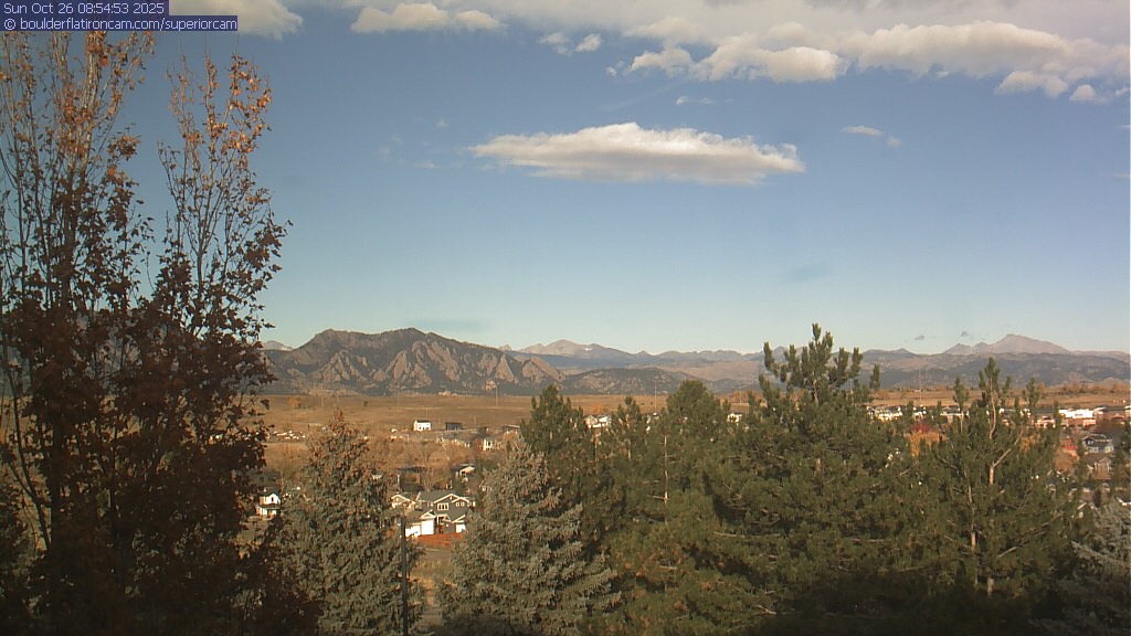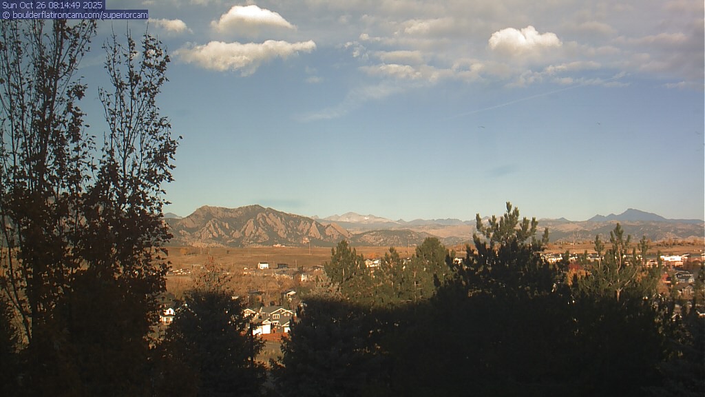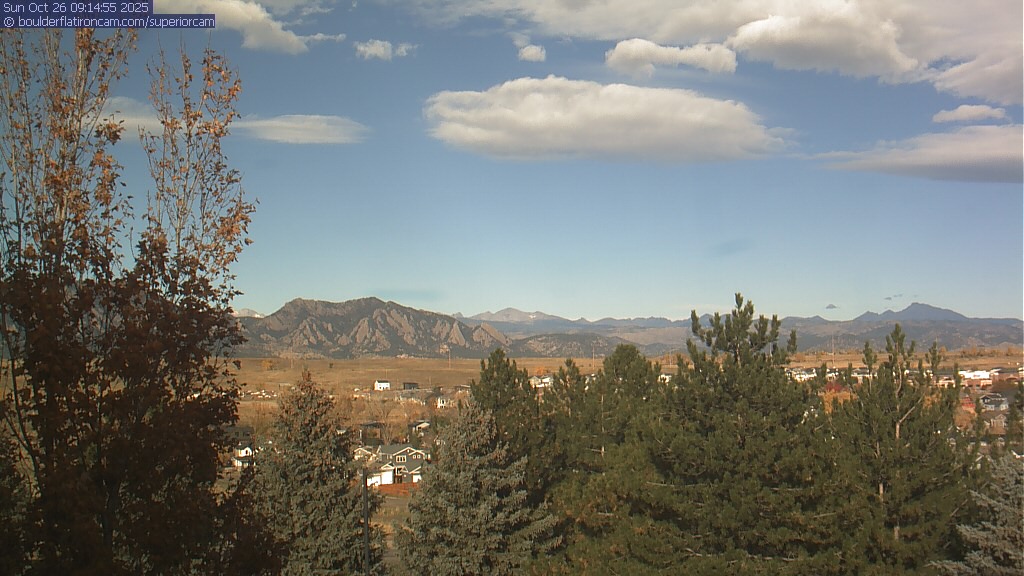 The Superior cam has a great view to the northwest over Boulder, the Flatirons, Indian Peaks and Long’s Peak.   The Coal Creek trail is visible in the foreground with old town Superior.  Thanks to Aweida Venture Partners management for the great view.