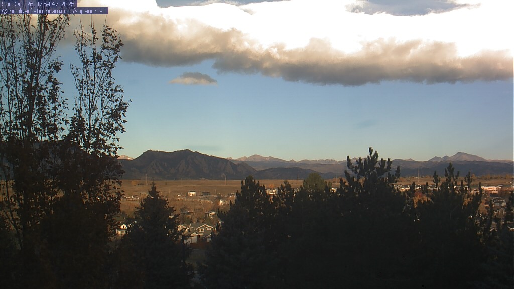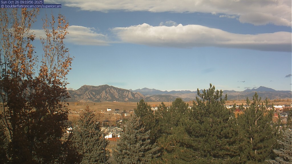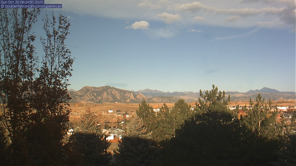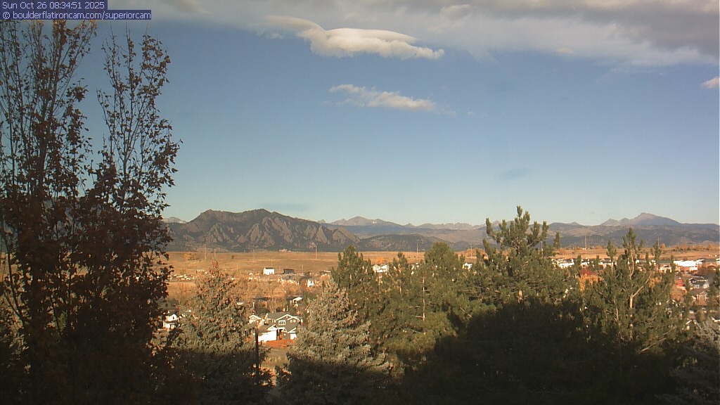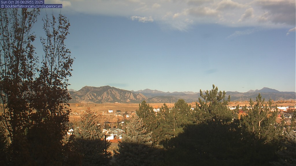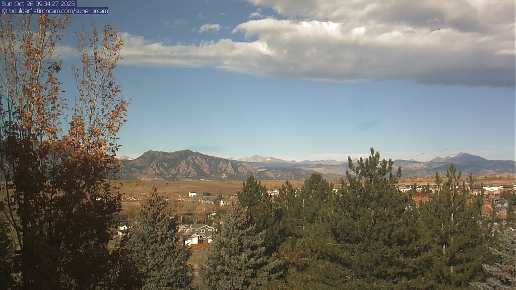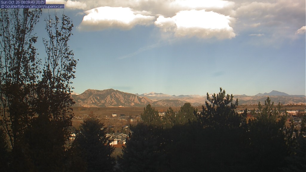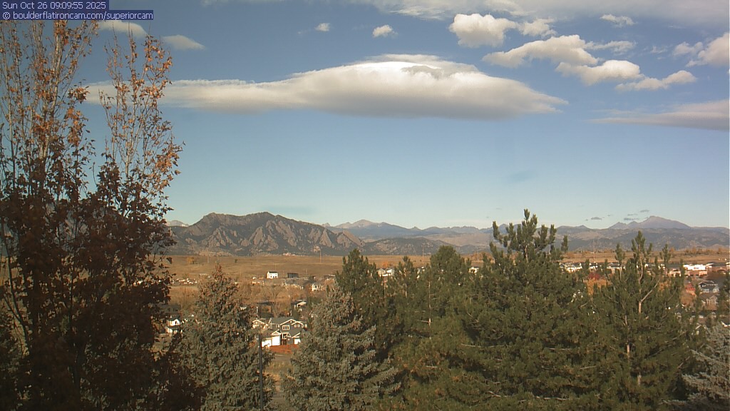 The Superior cam has a great view to the northwest over Boulder, the Flatirons, Indian Peaks and Long’s Peak.   The Coal Creek trail is visible in the foreground with old town Superior.  Thanks to Aweida Venture Partners management for the great view.