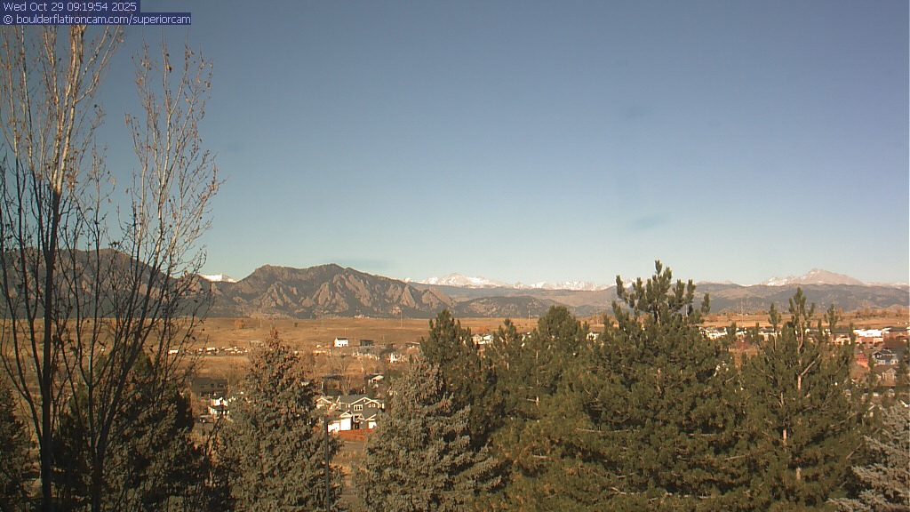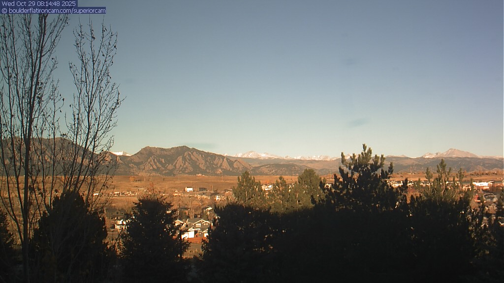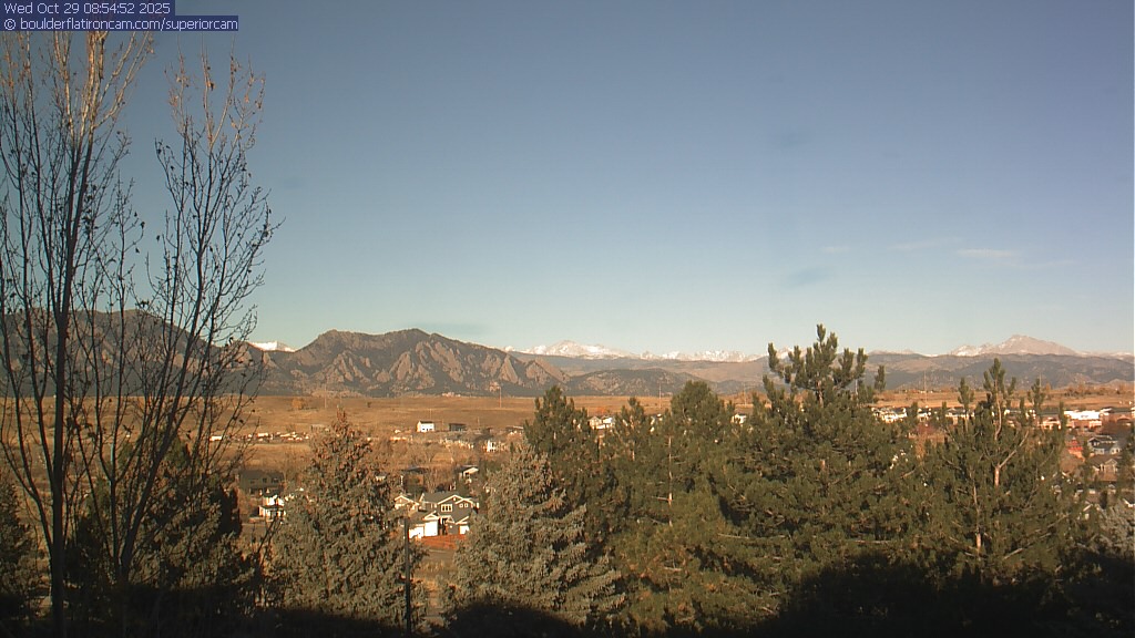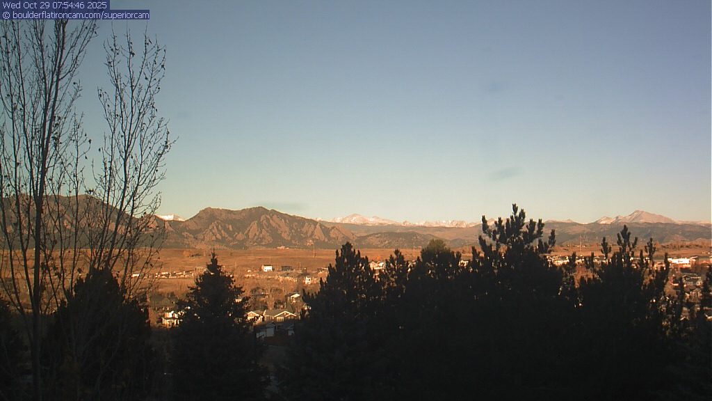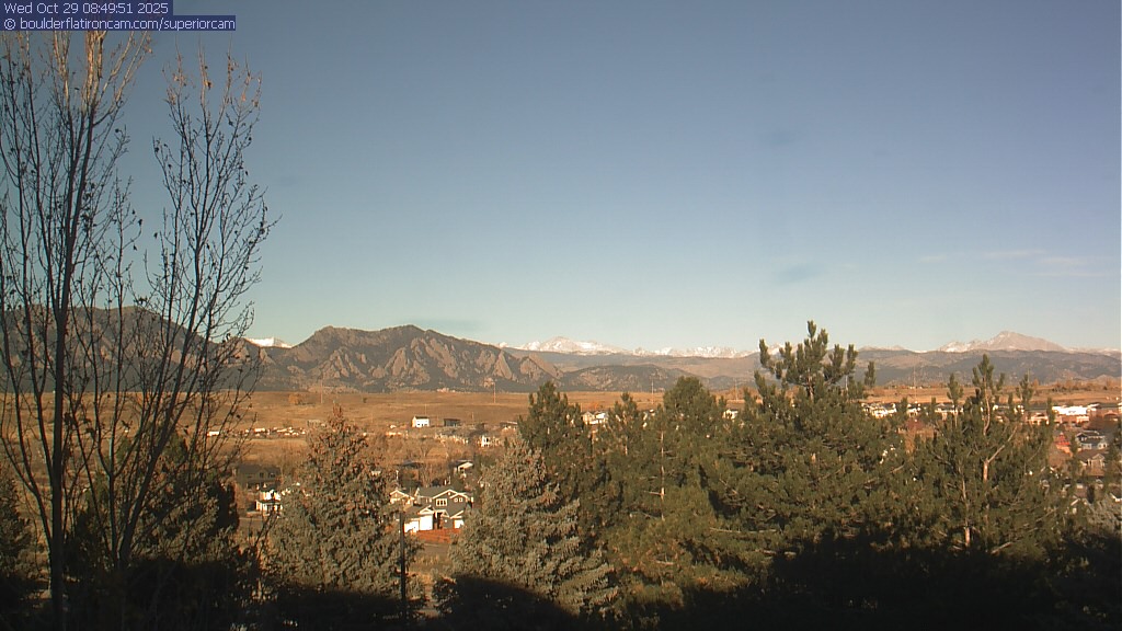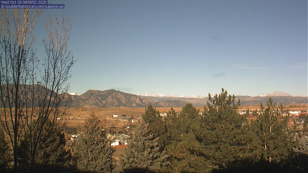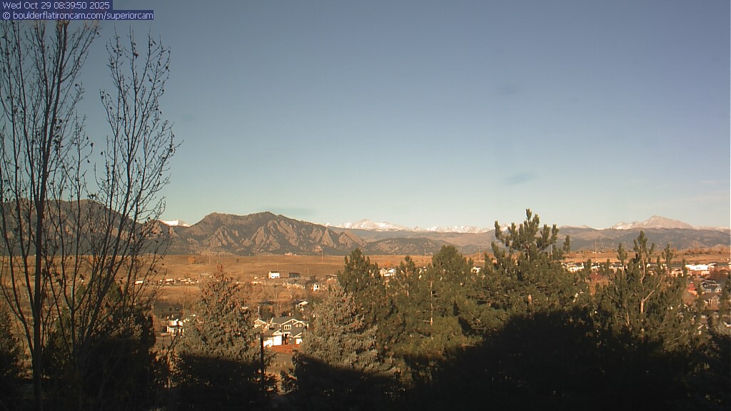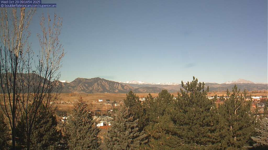 The Superior cam has a great view to the northwest over Boulder, the Flatirons, Indian Peaks and Long’s Peak.   The Coal Creek trail is visible in the foreground with old town Superior.  Thanks to Aweida Venture Partners management for the great view.