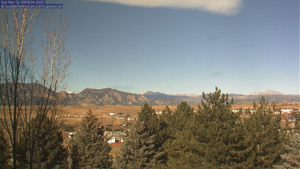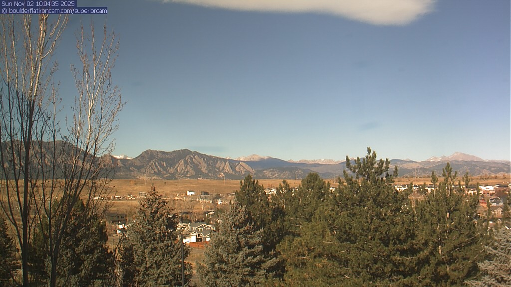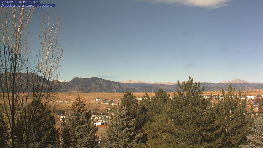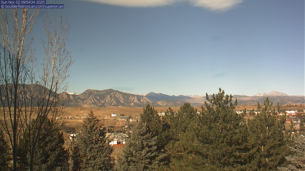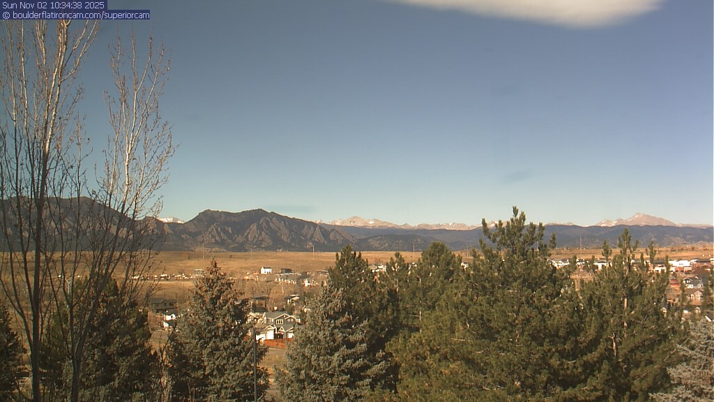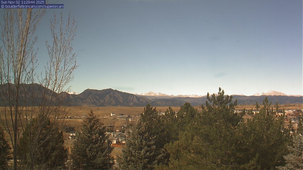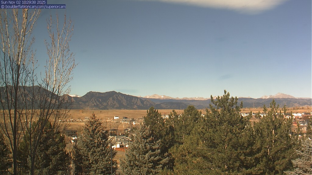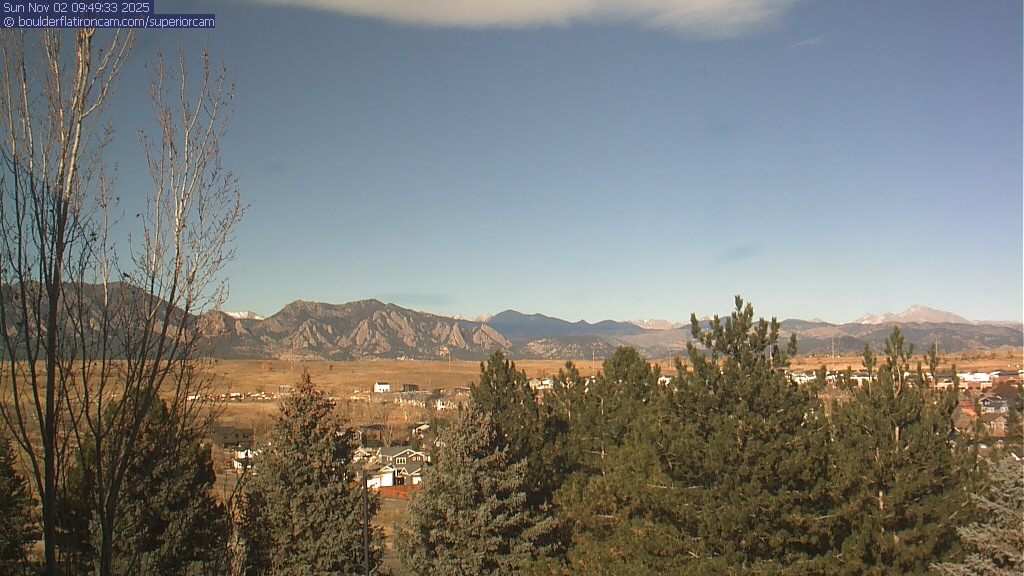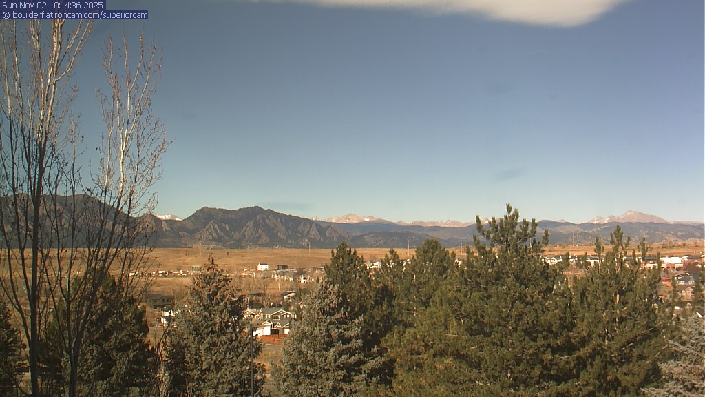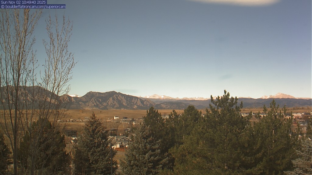 The Superior cam has a great view to the northwest over Boulder, the Flatirons, Indian Peaks and Long’s Peak.   The Coal Creek trail is visible in the foreground with old town Superior.  Thanks to Aweida Venture Partners management for the great view.