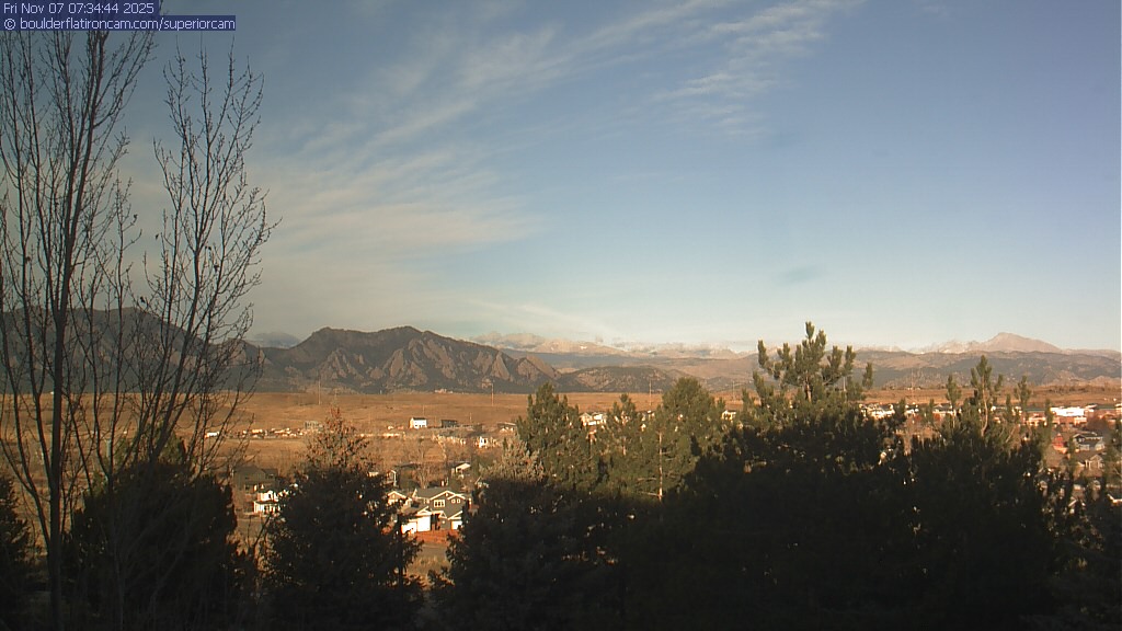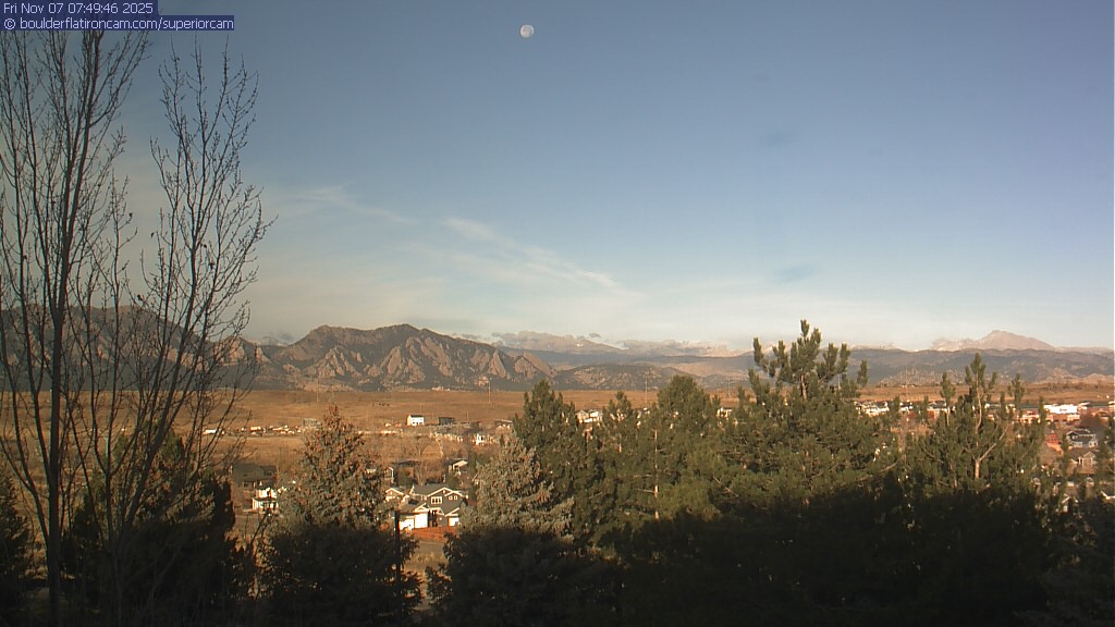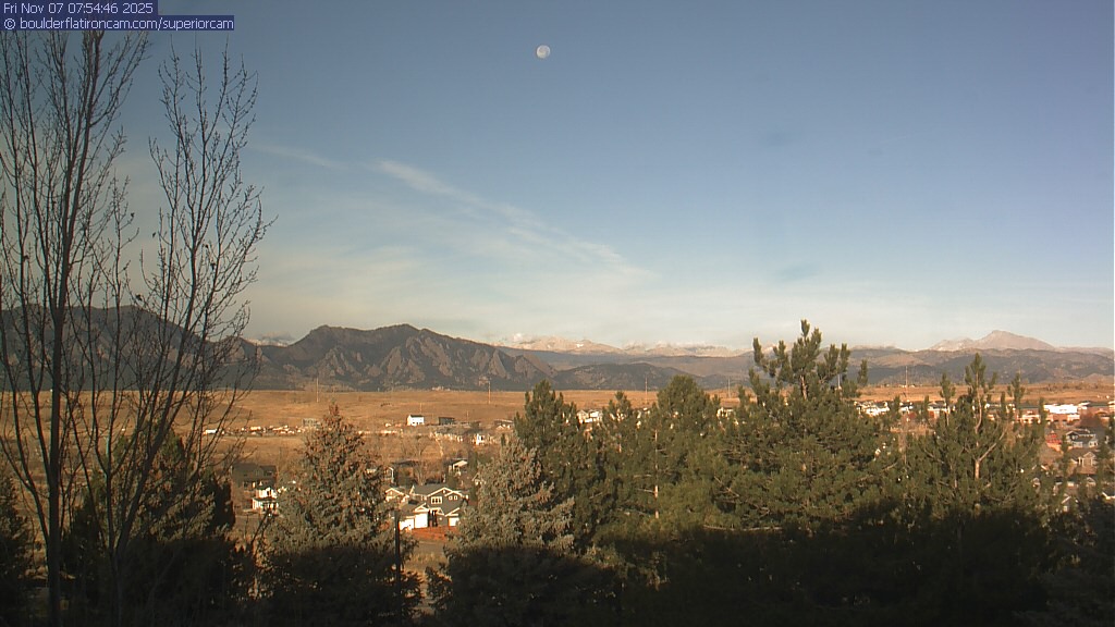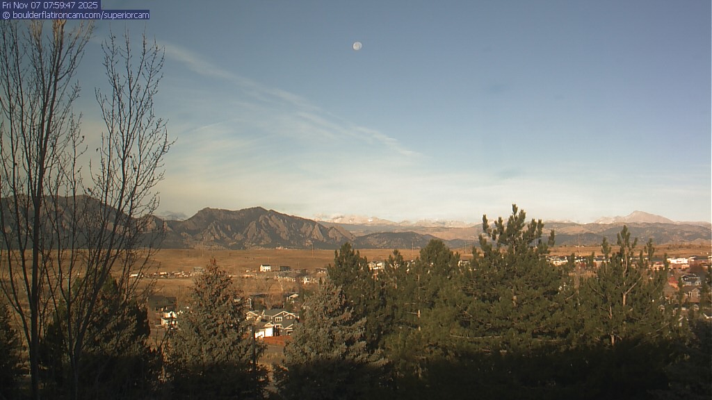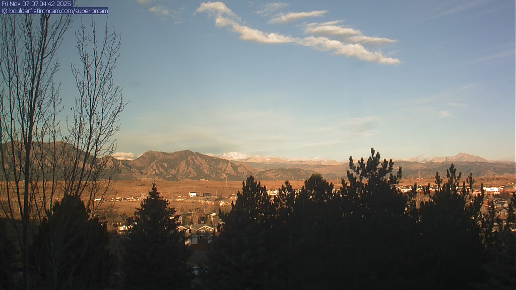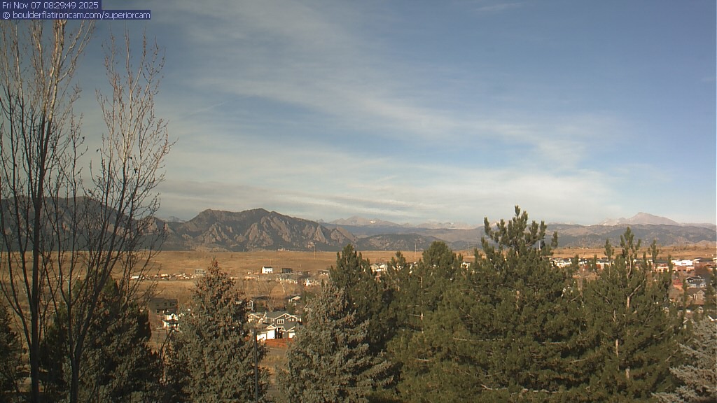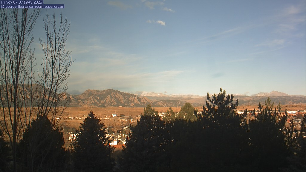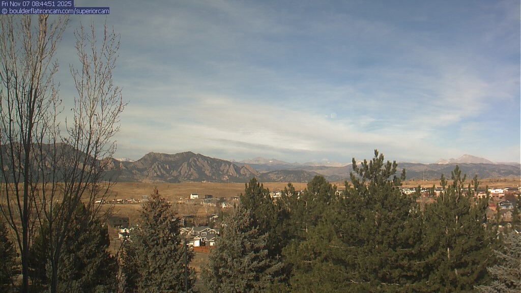 The Superior cam has a great view to the northwest over Boulder, the Flatirons, Indian Peaks and Long’s Peak.   The Coal Creek trail is visible in the foreground with old town Superior.  Thanks to Aweida Venture Partners management for the great view.