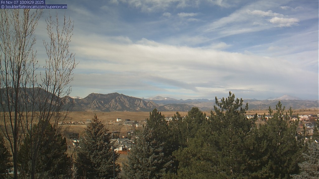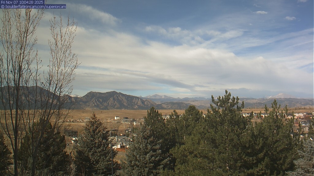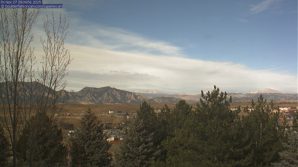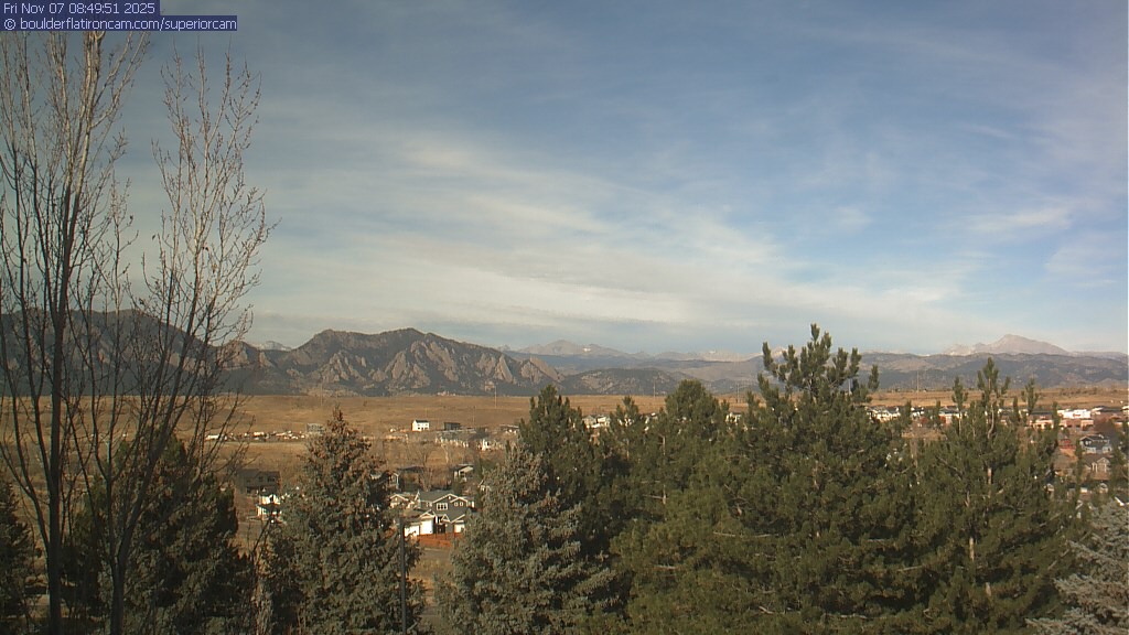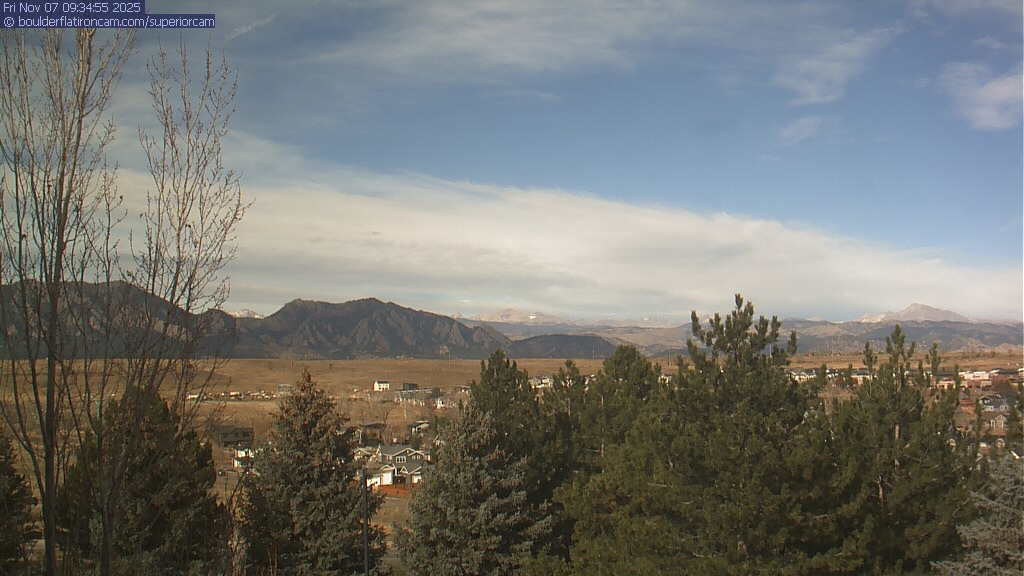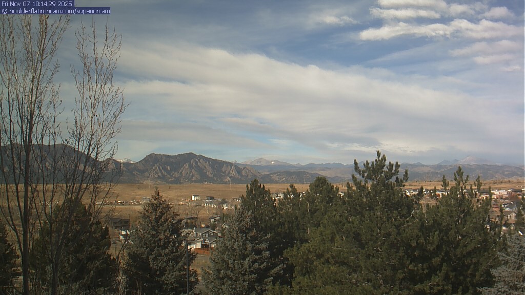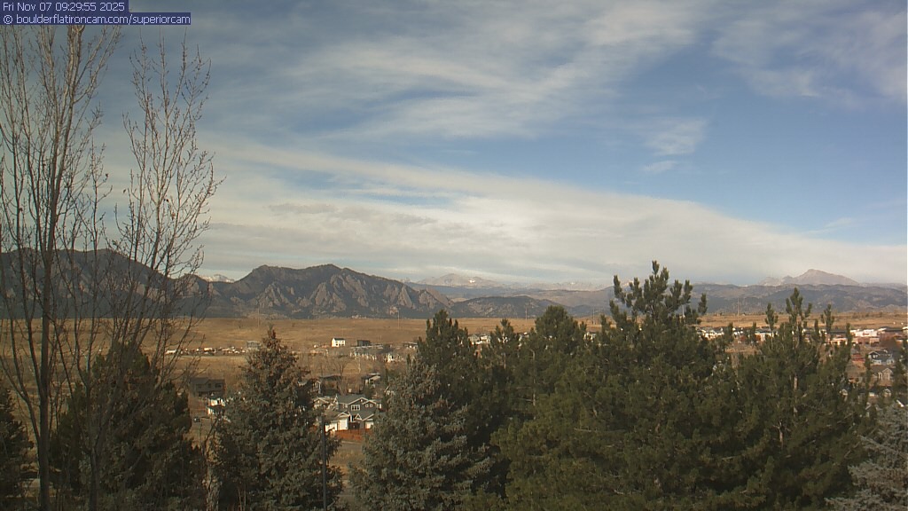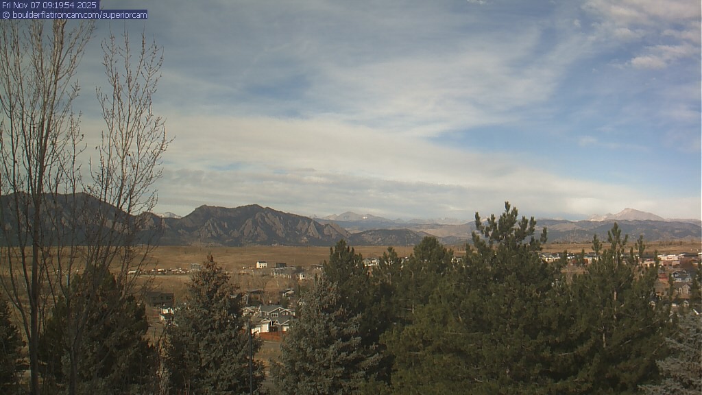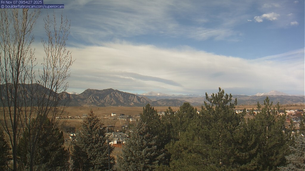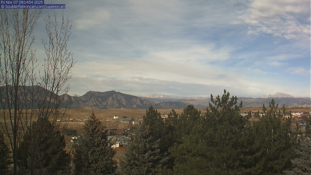 The Superior cam has a great view to the northwest over Boulder, the Flatirons, Indian Peaks and Long’s Peak.   The Coal Creek trail is visible in the foreground with old town Superior.  Thanks to Aweida Venture Partners management for the great view.