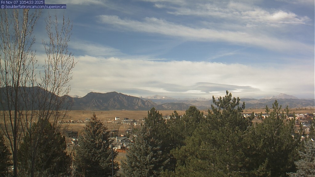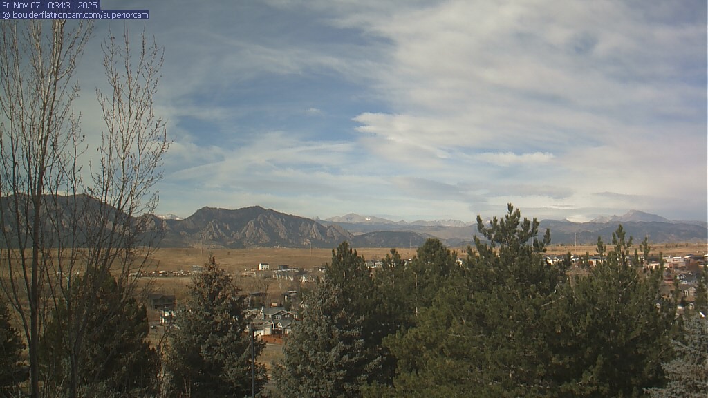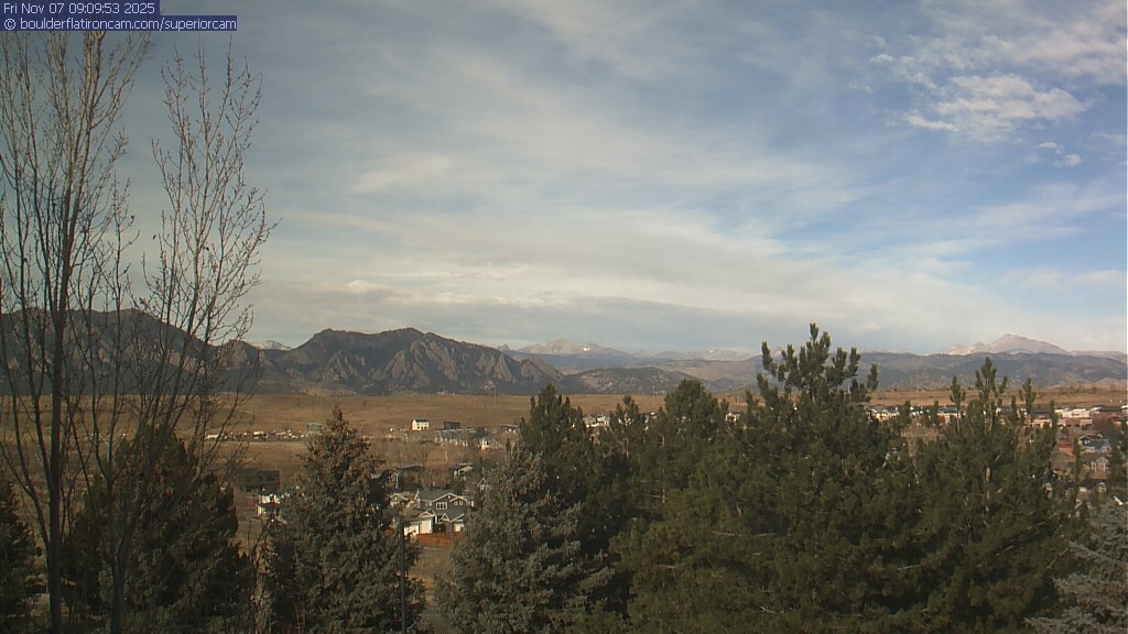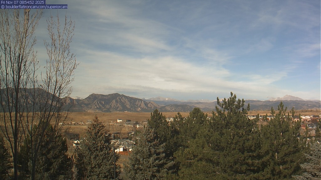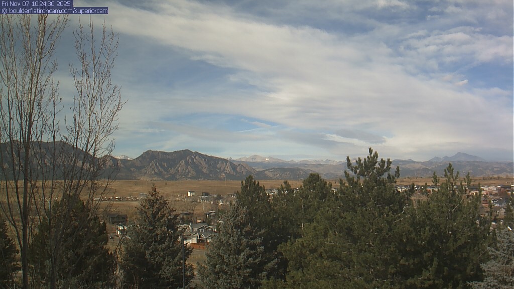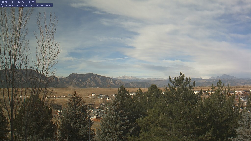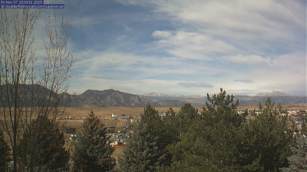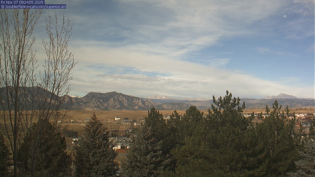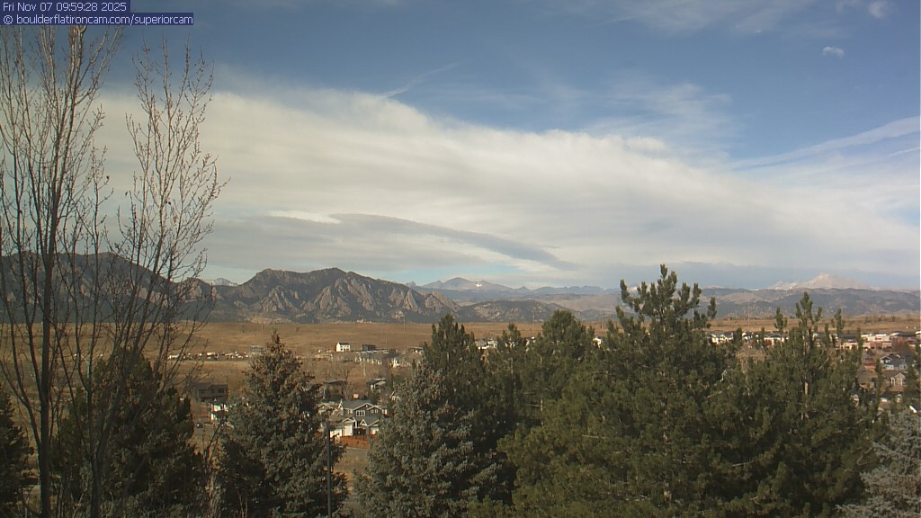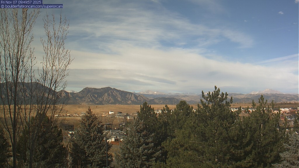 The Superior cam has a great view to the northwest over Boulder, the Flatirons, Indian Peaks and Long’s Peak.   The Coal Creek trail is visible in the foreground with old town Superior.  Thanks to Aweida Venture Partners management for the great view.
