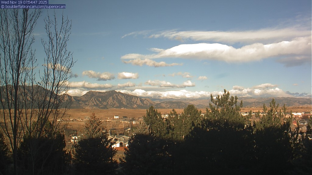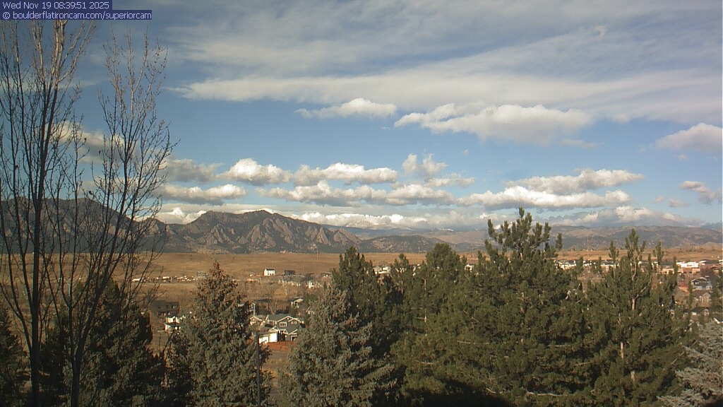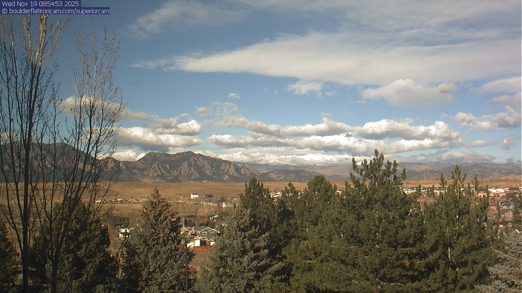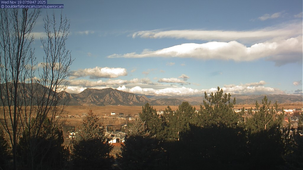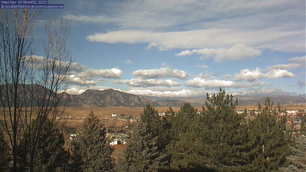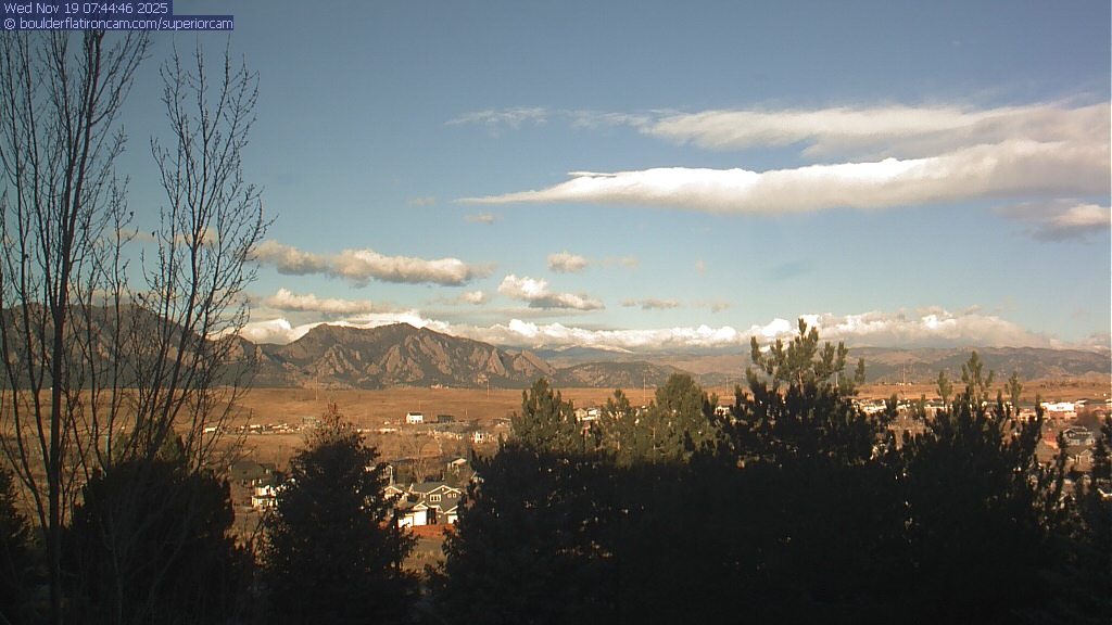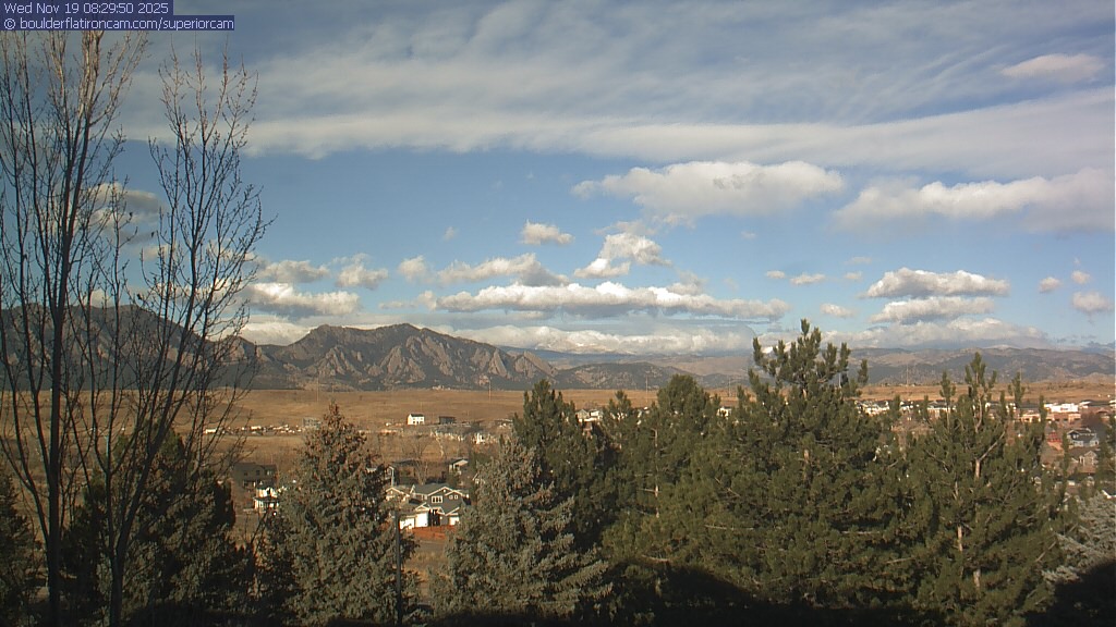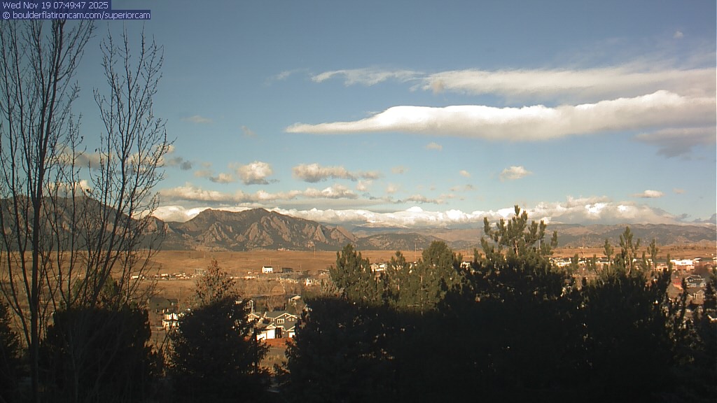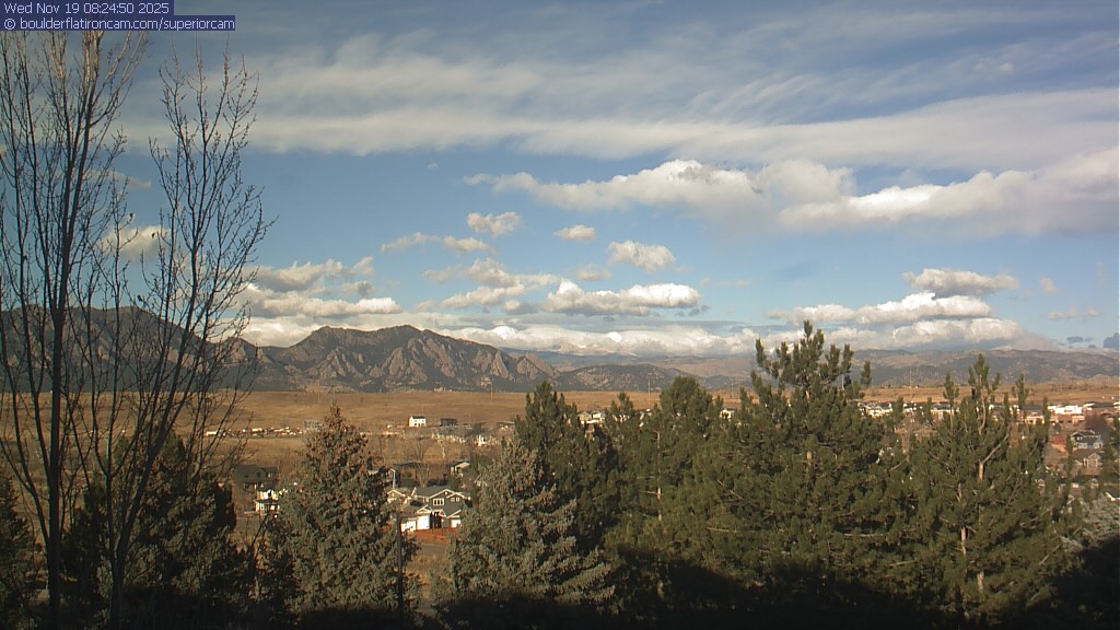 The Superior cam has a great view to the northwest over Boulder, the Flatirons, Indian Peaks and Long’s Peak. The Coal Creek trail is visible in the foreground with old town Superior. Thanks to Aweida Venture Partners management for the great view.