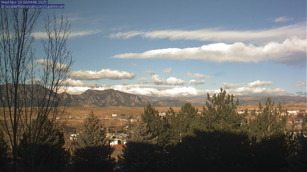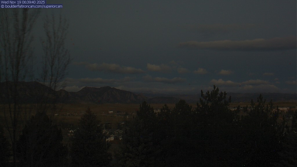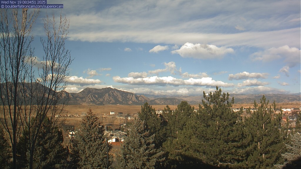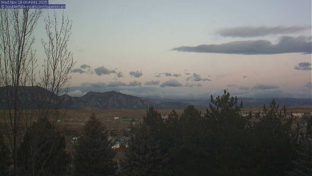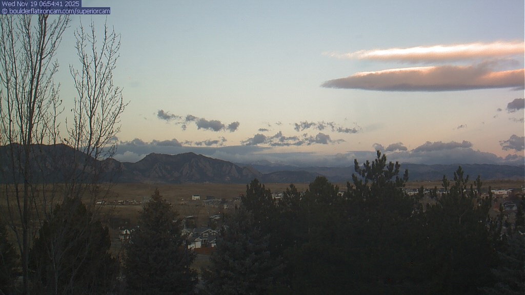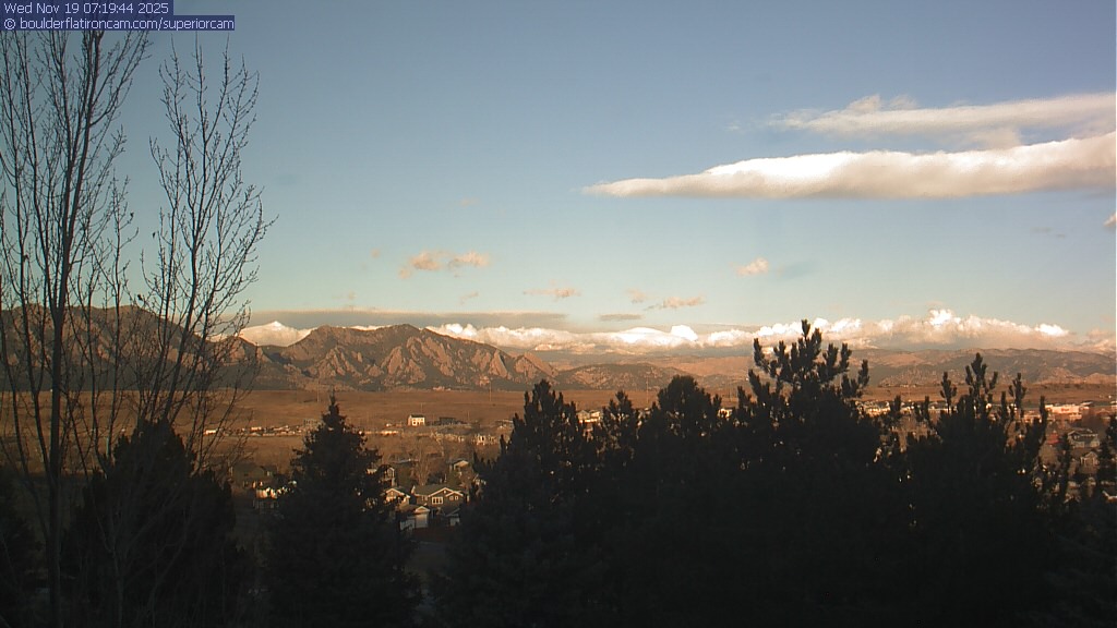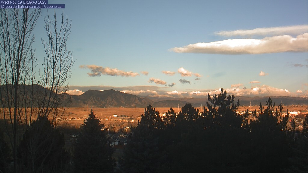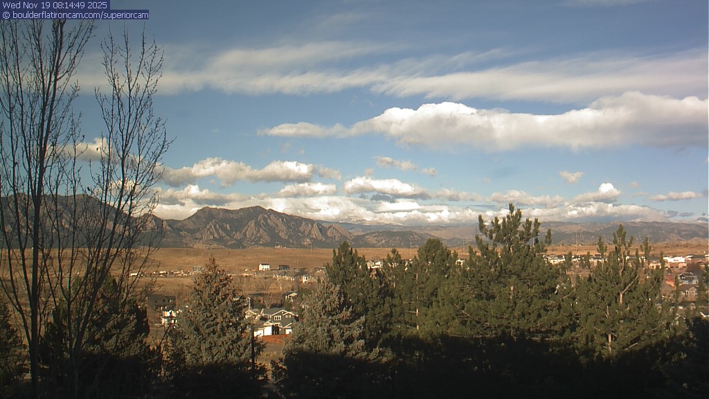 The Superior cam has a great view to the northwest over Boulder, the Flatirons, Indian Peaks and Long’s Peak. The Coal Creek trail is visible in the foreground with old town Superior. Thanks to Aweida Venture Partners management for the great view.